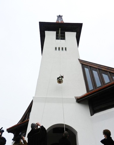 Hideg szél fúj, mindenki fázósan húzza össze magán a kabátot, az idő nem emlékeztet virágvasárnapra, a levegőben azonban érződik, hogy különleges ez a nap. A harang- és a templomszentelésre készülve a helvéciaiak teljesen megtöltik a régi imaház gyülekezeti termét. Miért nem mennek be a templomba? – érdeklődöm. – Oda „csak" kétszázan férnek be, átadjuk a helyet a vendégeknek. Mi az év ötvenkét hetéből ötvenegy vasárnap ülhetünk ott, a vendégek csak most – kapom a választ, amelyből kiderül, valóban vendégszerető emberek között járok. A gyülekezet kivetítőn nézi, ahogyan az új harang a magasba emelkedik, majd a helyére kerül, miközben Hegedűs Béla esperes mond áldást.