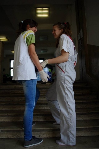 Egy népesebb csapat a folyosón ügyködött, hogy az összerugdalt, kopott folyosófalat fehérre kenje, néhányan mögöttük gondosan feltörölgették a friss festékfoltokat, hogy ne száradjon oda a kövezetre. Az egyik osztályterem előtt szülők álldogáltak, és a kipakolt padok, székek mögül nézegettek be az egyik frissen festett osztályba.