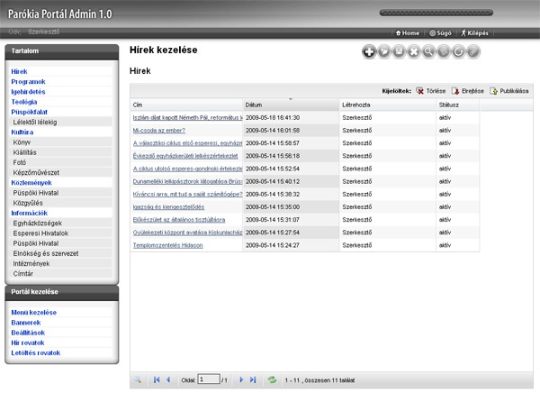 A "Hírek" tipusú oldalak tartalmát központi szerkesztőségünk is "látja", és ki tudunk emelni cikkeket azok tartalmából a főportál hírrovatába is.