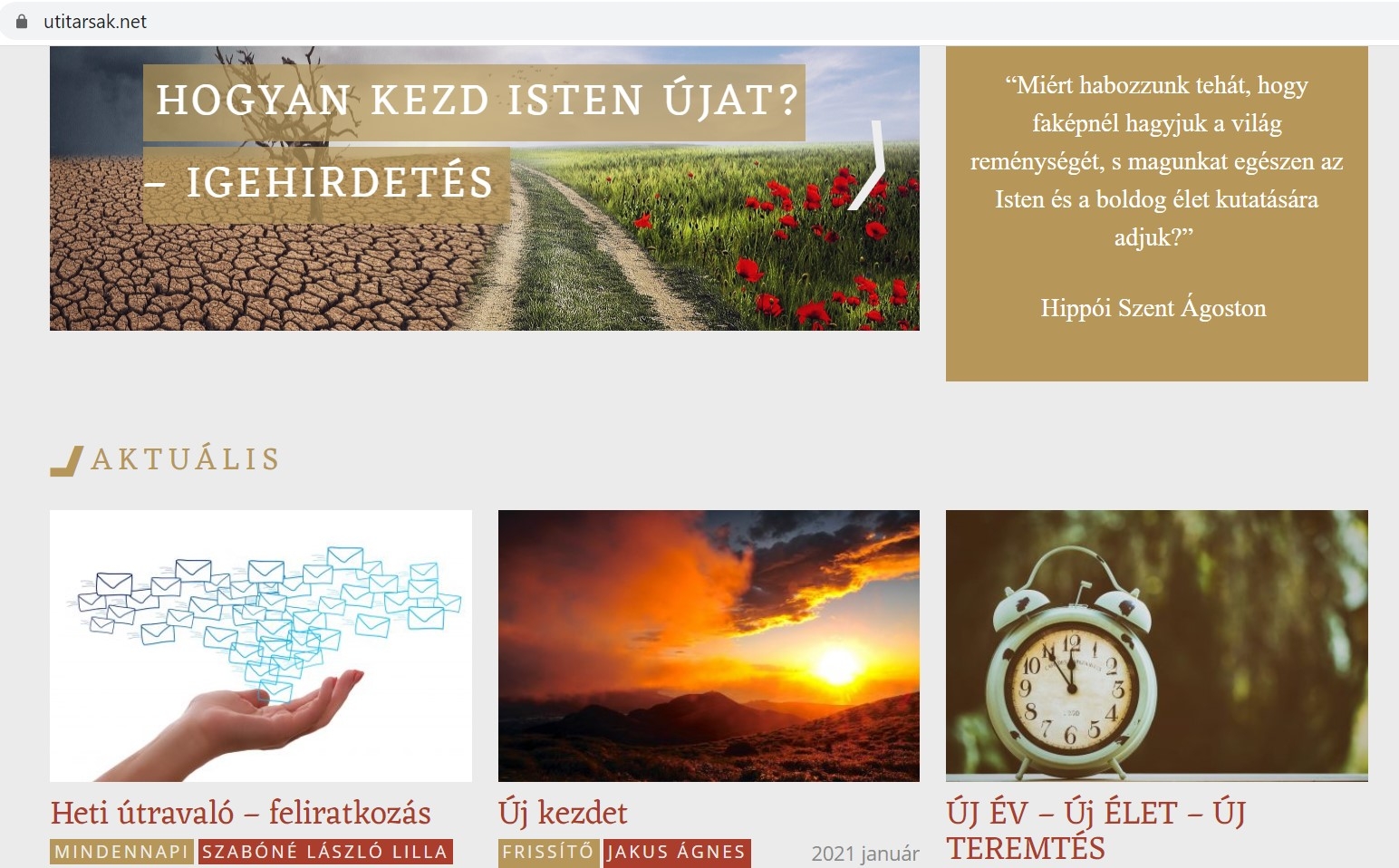 Tavaly szeptemberben indult útjára a protestáns spiritualitást középpontba állító Lelkiségi Műhely új honlapja, az Útitársak. Krisztussal, amely írásaival a kegyesség útján kíséri a Krisztus-követő olvasót. A 2021. januári szám írásai az új év – új élet – új teremtés gondolatkörébe rendeződnek. „A különböző emberek más és más módon viszonyulnak az újhoz. Van, aki az újdonságban, a változatosban leli örömét. Az adja a lendületet, a hívószót. Vannak, akiket az állandóság tart meg: az ismétlődés kiszámítható ritmusa” – írja szerkesztői előszavában Szabóné László Lilla.
