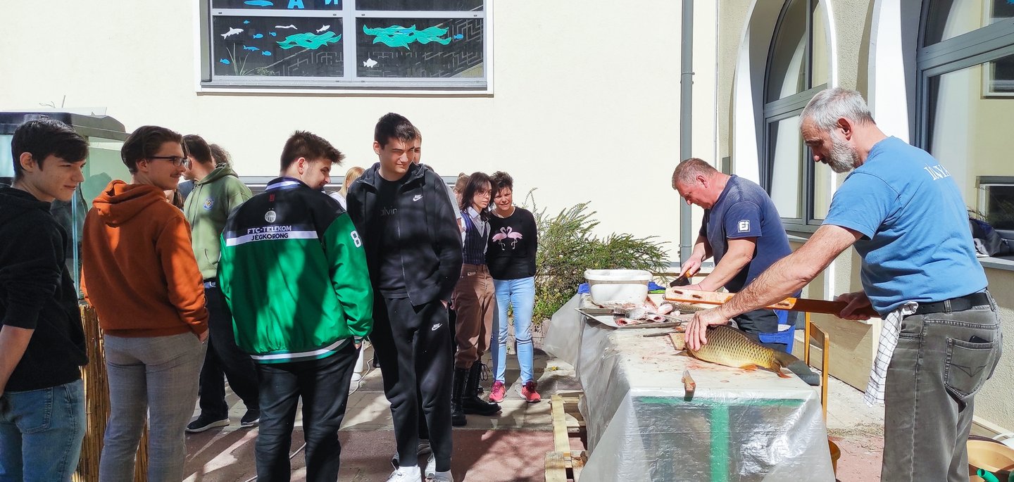 Gimnáziumunk igazgatója interaktív előadásában mutatta be hazánk békés és ragadozó halainak jellemzőit, majd a szerdai napon, Bognár Ferenc igazgatóhelyettes, Budai József gondnok, Szabados Gyula és Kovács László technikai dolgozók hathatós és áldozatos együttműködése nyomán a halak belső anatómiai felépítésével is megismerkedhettek az érdeklődő diákok. Akiknek kedvük tartotta, hazai nemes halaink gasztronómiai értékeit is felfedezhették halászlé és rántott ponty kóstolása közben, köszönet Scholtz Csilla munkatársunknak konyhafőnöki szerepvállalásáért.