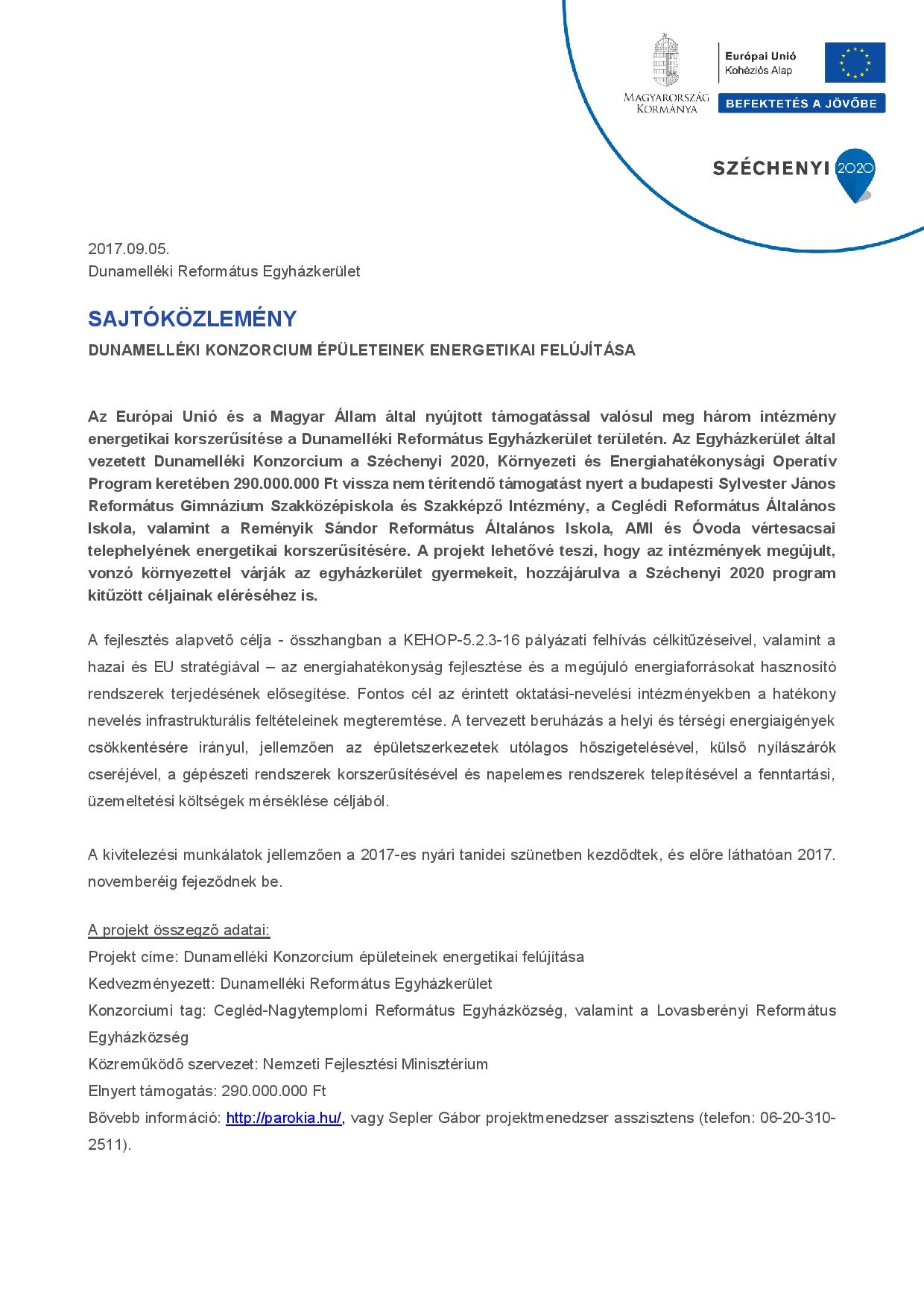 Sajtóközlemény KEHOP-5.2.3-16-2016-00081 KEOP 2017. szeptember 21., csütörtök A Dunamelléki Konzorcium épületeinek energetikai felújítása Csatolt állományok Sajtóközlemény