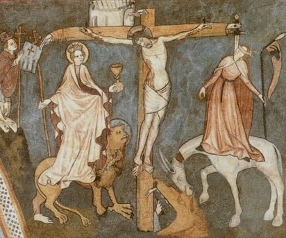 Valaki küldött nekem egy képet a „cselekvő” keresztről. Krisztus mozdulatlan, szeme lezárva, ám a kereszt, melyre feszítették, megelevenedik. Baloldali ágából egy kéz az egyház képviselőjének zászlajára mutat, miközben a jobboldali kéz gyilkol, tört használ valaki ellen, fenn
