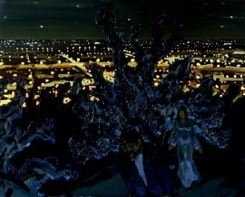 Tenk László képének címe: Szomorú virágzás. Mi van a képen? Egy szomorú ember, megy (hova, mibe?), mögötte az elvesztett nő alakja, a virágzásba csavarodott fával, mögötte tárul az éjszaka, és annak fényei. A férfiarc, a nőalak, a fa, mind homályba vont, kékfeketeszürke.