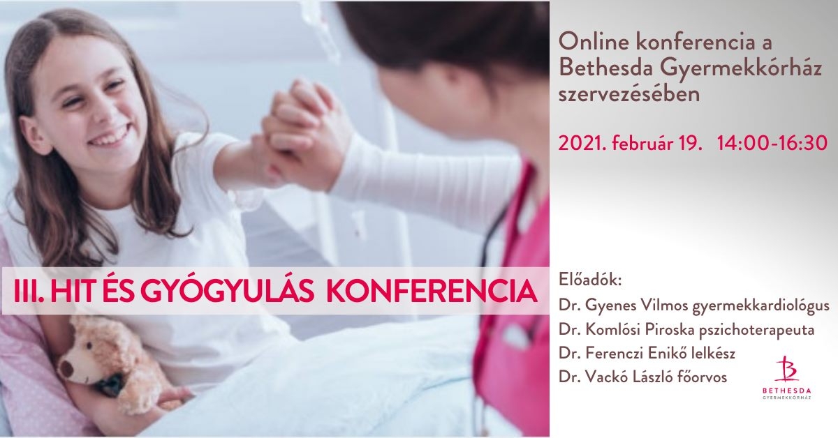 Harmadik alkalommal kerül sor a Bethesda Gyermekkórház Hit és gyógyulás konferenciára, amelyet ezúttal – a járványhelyzetre való tekintettel – online formában tartanak meg 2021. február 19-én, pénteken 14:00 és 16:30 között. A szervezők szeretettel várnak rá minden érdeklődőt, aki számára fontos üzenetet hordozhatnak a hit és gyógyulás összefüggései. A sokféle területről érkező előadók a szakmai ismereteken és az elgondolkodtató kérdésfeltevéseken túl olyan élményanyagot is ígérnek a résztvevőknek, amelyet magukkal vihetnek a szívükben. A rendezvény ingyenes, de előzetes regisztrációhoz kötött.