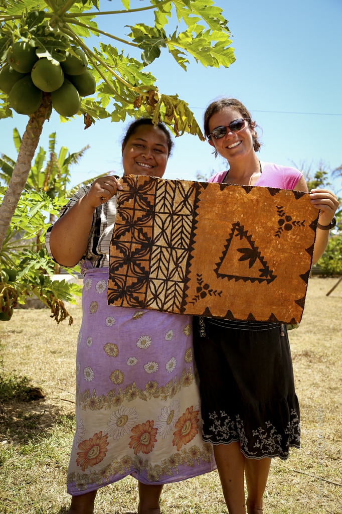 A templomnak hiányzik a teteje. Esővíztárazók, rajtuk nagy betűkkel, hogy az ausztrál kormány jóvoltából épültek. Malacok, csirkék szaladgálnak. Kiszáradt kertek, száraz kukoricával. Az egyik kerítés mögül kedvesen ránk köszön egy asszony. Kicsit beszélgetünk, elmondja, hogy ő a lelkész felesége, négy éve vannak itt a faluban. Idén januárban az Ian ciklon végigsöpört Tongán és hatalmas pusztítást végzett, az elmúlt 40 év legnagyobb vihara volt. Ez vitte el a templom tetejét és a part menti házakat. Most pedig szárazság van, már két hónapja nem esett az eső. Mindezt mosolyogva, tárgyilagosan meséli, a szegény emberek türelmes, megadó alázatával. Kérdezi, van-e valamink a hajón, amire esetleg nincs szükségünk, szívesen vennék. A kapitányunk hozott magával egy kis csomagot, sampon, szappan és körömlakk van benne, azt odaadja. Juliet (akit nagyon megszeretek, mert papné, mint az édesanyám, még a nevük is hasonlít) felajánlja, hogy van tapa vászna, faháncsból készített kézműves papír, ősi polinéz kézműves munka, nagyon kevesen csinálják ma már, ha meg akarjuk nézni, eladó. Bánt, hogy visszautasítjuk, bár a hajón ilyesmire tényleg nincs szükség és hely. Elbúcsúzunk, de ahogy sétálunk tovább, tanakodunk: a kapitányunk sajnálja, hogy körömlakkot adott egy asszonynak, aki a létszükségleteiért küzd. Talán illetlenség volt. Ezek az emberek túléltek egy ciklont, ami elvitte a házaikat, utána hónapokig nem esik az eső. Milyen küzdelem lehet ilyen körülmények közt talpon maradni? A visszafelé vezető úton újra beköszönünk, ekkor már én kérem, mutassa meg a tapa vásznait, készségesen hozza őket, közben büszkén mutatja a kapitányunknak, hogy már kilakkozta a körmét. Erre mindhárman fellélegzünk, nem volt illetlenség, van itt még életkedv. Ahogy térül-fordul, egy-egy kókuszdiót is felbont és a kezünkbe nyomja frissítőnek. Sugárzik belőle a nyugalom és az életszeretet. Kiválasztom a legszebb vásznat, azt mondja, annyit adjak érte, amennyit gondolok, ez adomány a templom újjáépítésére. Elgondolkodok, vajon mikor téved ide majd a következő vásárló? A hajóra visszafelé a táskánk nehéz a tapa mellé kapott kókuszdióktól és papayától, a lelkünk viszont könnyű és mosolyog, mert Julietben a szárazságban-nehézségben is volt annyi játékosság és ünnep, hogy kilakkozza a körmeit."
