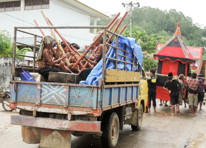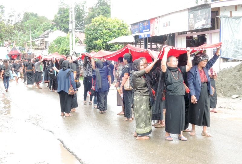 Asszonyok a fejük felett hatalmas vörös leplet húznak. Van vagy tizenöt méter. A lepel vége egy díszesen faragott koporsóhoz van kötve. A koporsót bambuszrudakon fiatal férfiak viszik, szinte rohannak vele, üvöltöznek, nevetnek, van, hogy nem bírják, leteszik, rugdossák a sarat, majd ismét fölkapják, szaladnak tovább. Mögöttük egy teherautón vénasszonyok ülnek, és bambuszdorongokkal egy hosszú farönköt döngölnek. Adják a ritmust, hajtják a menetet előre.