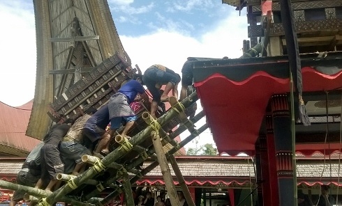 A temetési szertartás a legtöbbször azért húzódik el, mert a családnak össze kell gyűjtenie a rengeteg pénzt az áldozati bivalyokra, amit az indonéz kormány különadókkal igyekszik megnehezíteni. Egy átlagos temetésen hét–huszonnégy bivalyt ölnek le, de egy tehetősebb ember esetén nem ritka, hogy száznál is többet. A bivalyoknak kiemelt szerepük van, mert az elhunyt az ő hátukon utazik a toraja másvilágába, a Puyába. A holttesteket díszesen faragott koporsókba rakják, és sziklafalakba vájt üregekbe helyezik. Nem ritkák a függősírok sem, ahol a koporsót egy magasan belógó sziklapárkány felső részére erősítik. A legkülönösebb a csecsemők eltemetése. Ha egy kisgyermek még az első tejfogak kibújása előtt hal meg, a testét egy élő fa törzsébe vájt üregbe helyezik, melyet faháncsokból készült ajtóval zárnak le. Hitük szerint így a gyermek majd a fával együtt nő meg.