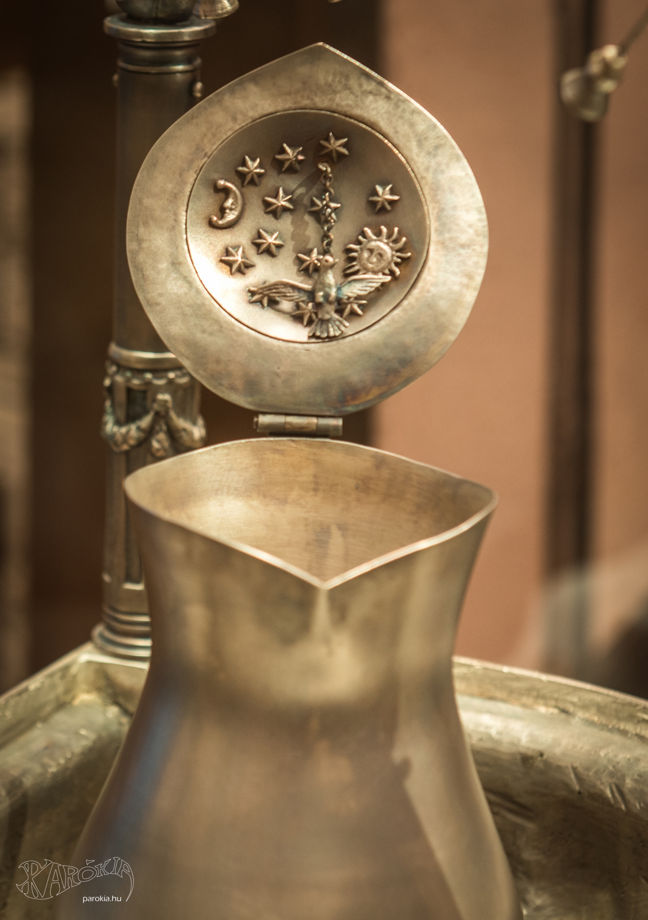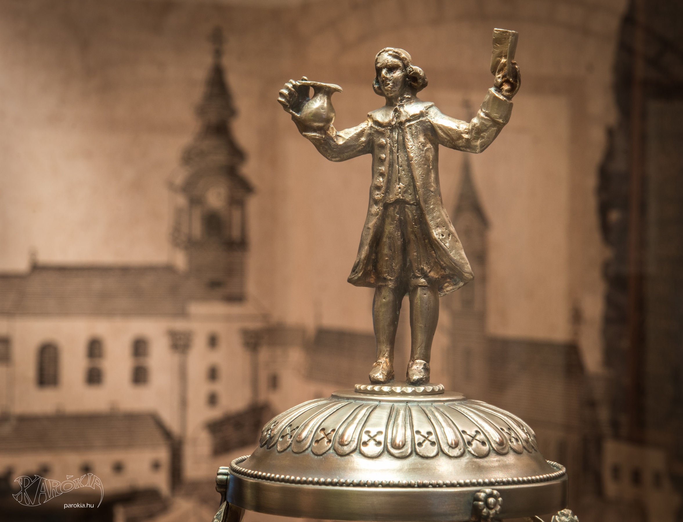 – A keresztelőkészlet szimbolikája rendkívül gazdag, aki egyszer látta ezt a tárgyat, valószínűleg soha nem felejti el. A készlet tetején egy lelkészt láthatunk, akinek a ruházata külön magyarázatot érdemel. A lelkipásztort nem palástban ábrázolták, hanem egy divatos francia viseletben, amely a németeken és osztrákokon keresztül érkezett Magyarországra. A fodros selyemingnek, a csatos cipőnek, és a térdnadrágnak nem mindig örültek az egyházban, azonban ennek a ruházatnak valószínűleg üzenete van, hiszen abban az időben a külföldön tanult, széles látókörű, tájékozott fiatalok viseltek hasonlót. A korszak lelkészei között feszültséget és presztízsharcot okozott, hogy melyikük végezte iskoláit külföldön és ki iskolázta magát csak itthon. A különbségek, főként a fennhéjázás ellen a püspökök ugyan harcoltak, az mégis megmutatkozott a tájékozottságban, a szemléletben, az életvitelben, az öltözködésben és a hajviseletben.