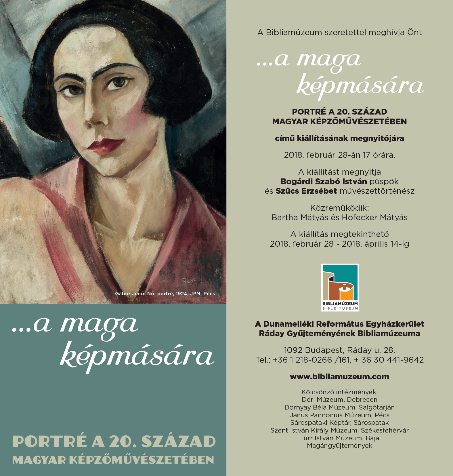 „...a maga képmására” – Portré a 20. század magyar képzőművészetéből 0 hozzászólás Időpont: 2018. február 28. 17:00 Helyszín: Bibliamúzeum, 1092 Budapest, Ráday utca 28. Programok Kiállításmegnyitó Csatolt állományok sajtóanyag