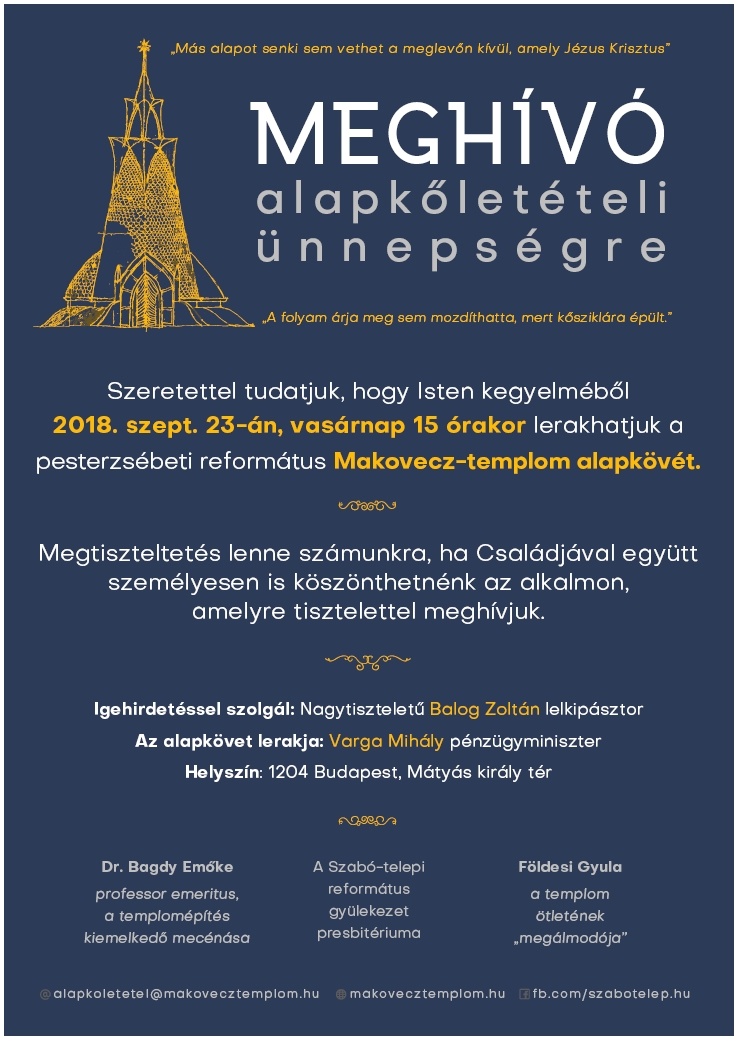 2018. szeptember 23-án vasárnap 15 órakor lesz a pesterzsébeti református Makovecz-templom alapkőletételi ünnepsége XX. kerület Mátyás király terén.