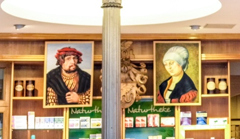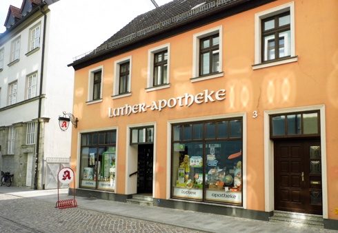 S akkor még nem is említettük a Luther- és Cranach-patikát, amelyek közül az utóbbiban a Luther-kor világhírű festőjének és feleségének nem túl jól sikerült, de azért mégiscsak a gyógyszertár kellős közepén díszelgő arcképét láthatjuk.