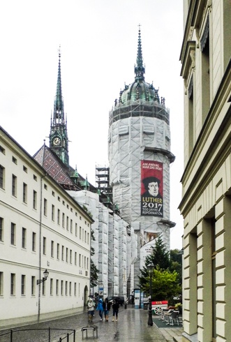 És, talán mondanom sem kellene, az „ikerházak" környékét s az egész várost mindenütt ellepik az óriási, választásiplakát-szerű molinók, Luther 2017 – 500 Jahre Reformation felirattal. Többek között a most felállványozott városi templomon és a vártemplomon. E grandiózus emlékeztetők mellett a már említett reformációs Disneyland-elemek sorában akad Luther-csoki, gyufásskatulya és söröspohár-alátét is.