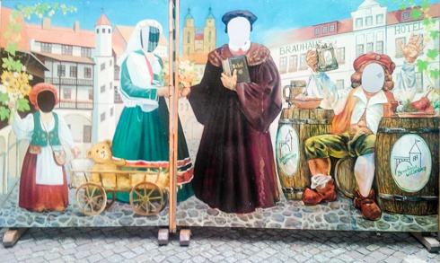A városban természetesen kapható Martin- és Katharina-címkés gyomorkeserű, s egy elegáns selyemsál-, selyemblúz-, selyemruhabolt közepén is Luther-szobrocska adja áldását a cifrálkodni vágyó hölgyekre. A Luther házasságkötését felidéző kampánymozzanatok közül viszont a Cranach-ház melletti serfőzde és exkluzív söröző említendő, ahol pityókás (vagy józan, de ez ritkább) állapotban a nagybetűs Reformátor és felesége kartonfiguráján kikukucskálva lehet fényképezkedni. Ottjártunkkor éppen egy népes és multikulti atlantai csoport tolongott, hogy fejét kidugja Martin és Katarina kartontestén, az arcnak kihagyott lyuk helyén. (Én ebben az esetben legalább a Bibliát kihagytam volna Márton nagytiszteletű úr kezéből. Elvégre az ízléstelenségnek is van határa!)