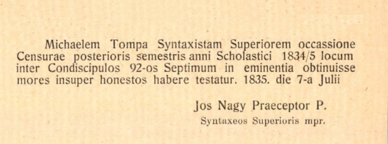 Tompa Mihály 1817. szeptember 28-án született Rimaszombaton, elszegényedett nemesi családban. Édesanyja halála után nagyszüleihez került Igricibe, ahol gyermekévei meghatározó élményeit szerezte. Ezen a változatos tájon és színmagyar településen oltódott lelkébe a természet szépségei iránt való rendkívüli fogékonyság és a magyar néplélek szeretete és ismerete. Itt járta az elemi iskolát, és pártfogóra talált Bihari György rektorban, aki felismerte a kisfiú éles eszét és tehetségét. A községben lakó Szentimrey földesúri családnak pártfogásába ajánlotta, az ő segítségükkel Tompa 1832 őszén a sárospataki kollégiumba került szolgadiáknak az említett család fiai mellé. A szolgadiák élete nem volt könnyű, gyakran saját ággyal sem rendelkezett, hanem összetolt széken aludt, lámpása a kályha tüze volt, amikor begyújtott gazdái szobájában. Tanított, szolgált és emellett tanult. Az 1834/35-ös tanévben már az „eminens” diákok között említik a nevét.