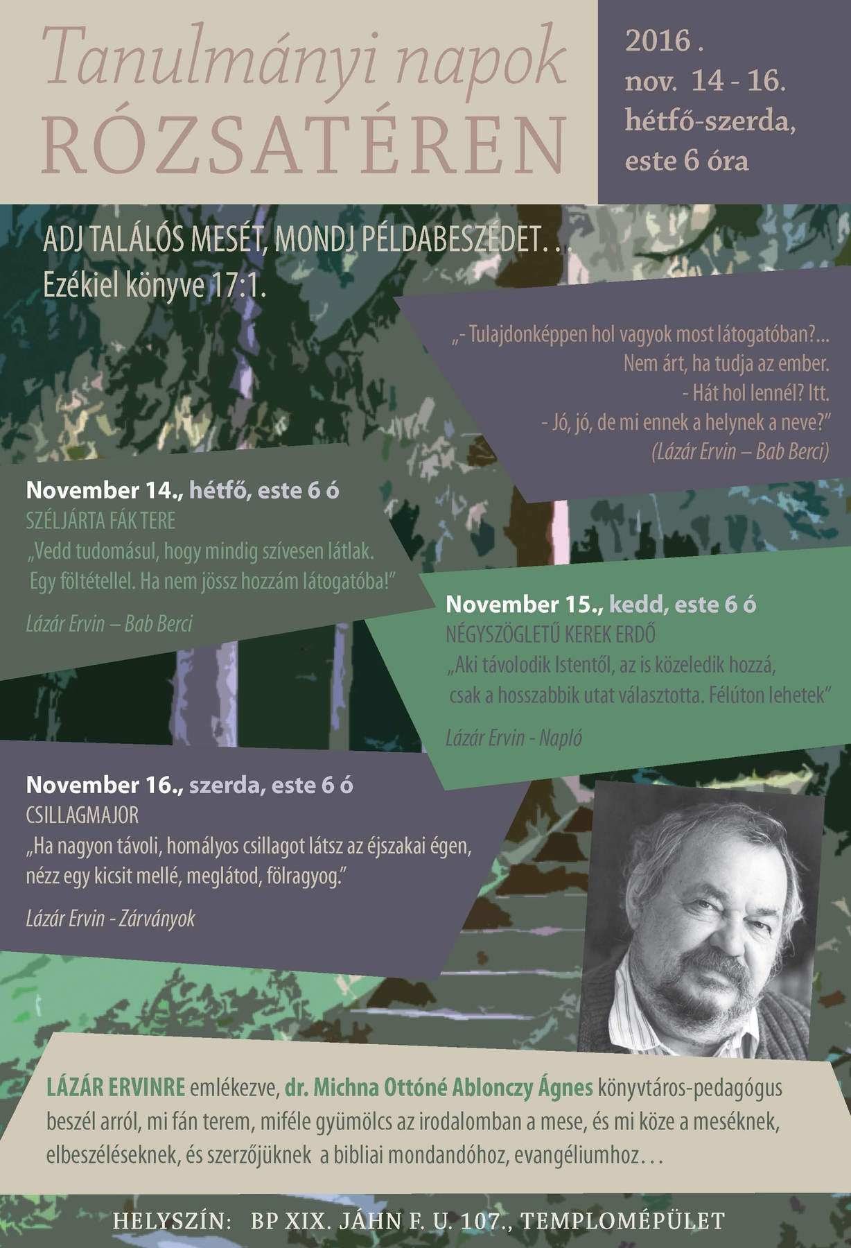 A Rózsatéri tanulmányi napok keretében három estén át Lázár Ervin világában próbálunk szerencsét dr Michna Ottóné Ablonczy Ágnes könyvtáros-pedagógus vezetésével.