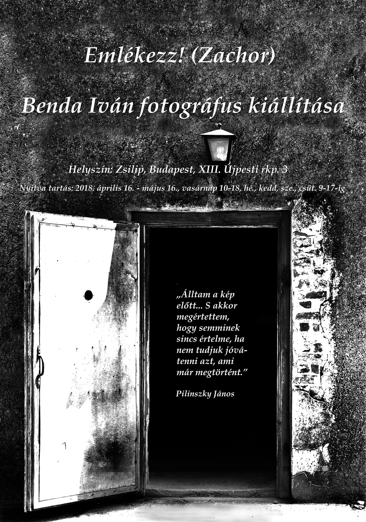 Benda Iván Emlékezz! – Zachor című fotómontázs-kiállítása május 16., szerdáig tekinthető meg a Zsilip Kulturális Központban (1137 Bp., Újpesti rakpart 1). Nyitvatartás: hétfőtől csütörtökig 9 és 3 óra között.
