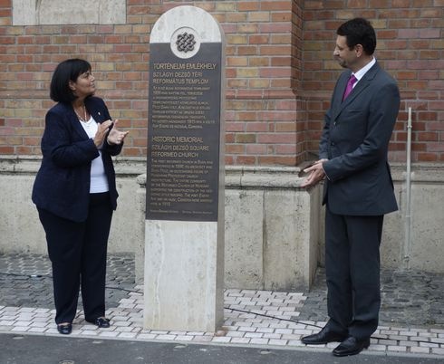 Radnainé Fogarasi Katalin hozzátette: országszerte 13 nemzeti és 47 történelmi emlékhelyet tartanak nyilván, amelyeket egységes sztélével, kőoszloppal jelölnek meg. Az oszlopokra az emlékhellyel kapcsolatos fontosabb információkat vésik be. A templom melletti sztélén a többi közt az is szerepel, hogy a Szilágyi Dezső téri templomban kötött házasságot 1915-ben Ady Endre és múzsája, Csinszka. Az elnök beszédében arra is kitért, reméli, hogy a lakosság megszokott találkozási pontjai felválthatók a sztélékkel, emlékhelyekkel.