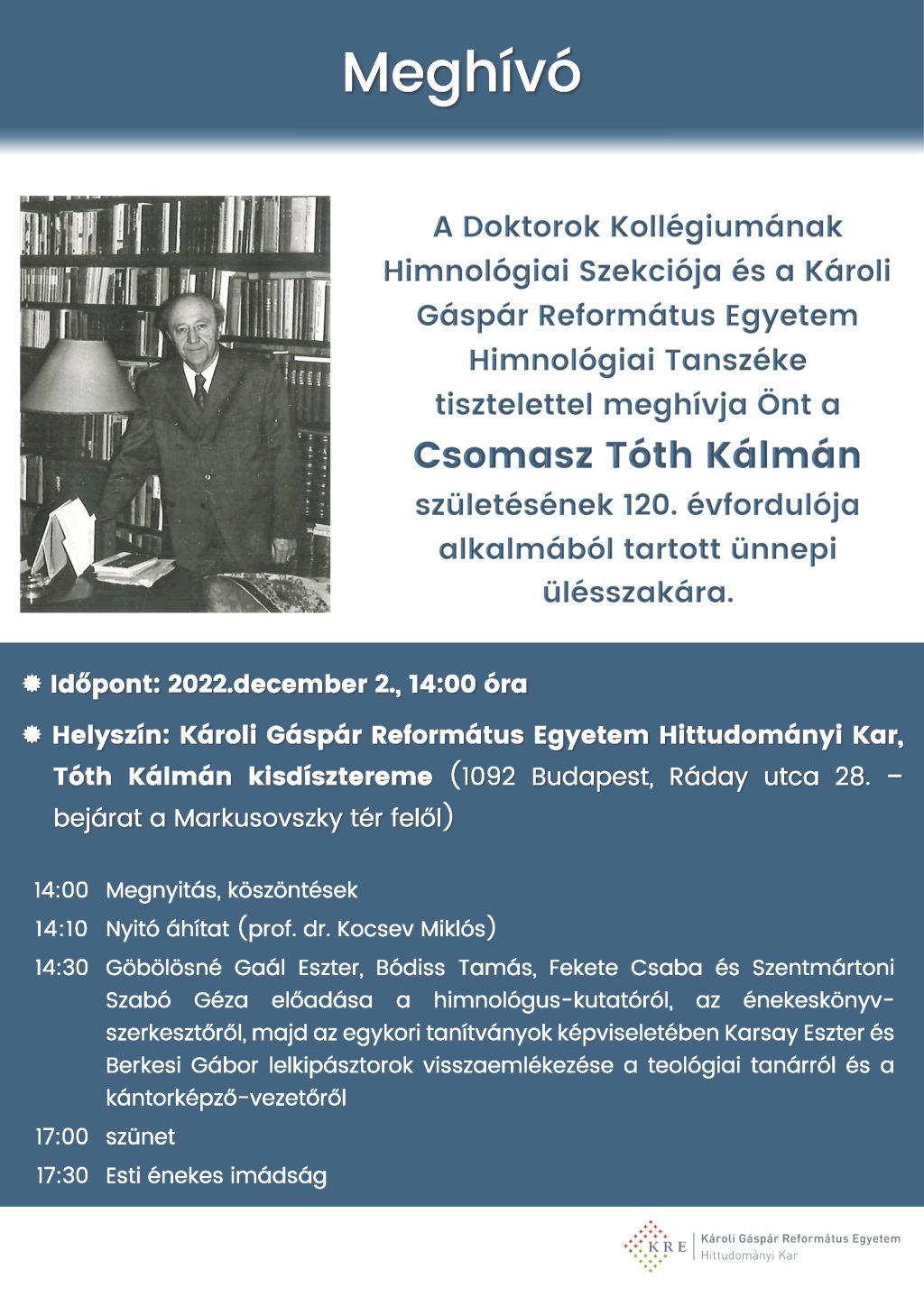 A Doktorok Kollégiumának Himnológiai Szekciója és a Károli Gáspár Református Egyetem Himnológiai Tanszéke tisztelettel meghívja Önt a Csomasz Tóth Kálmán