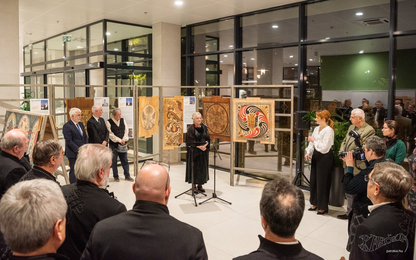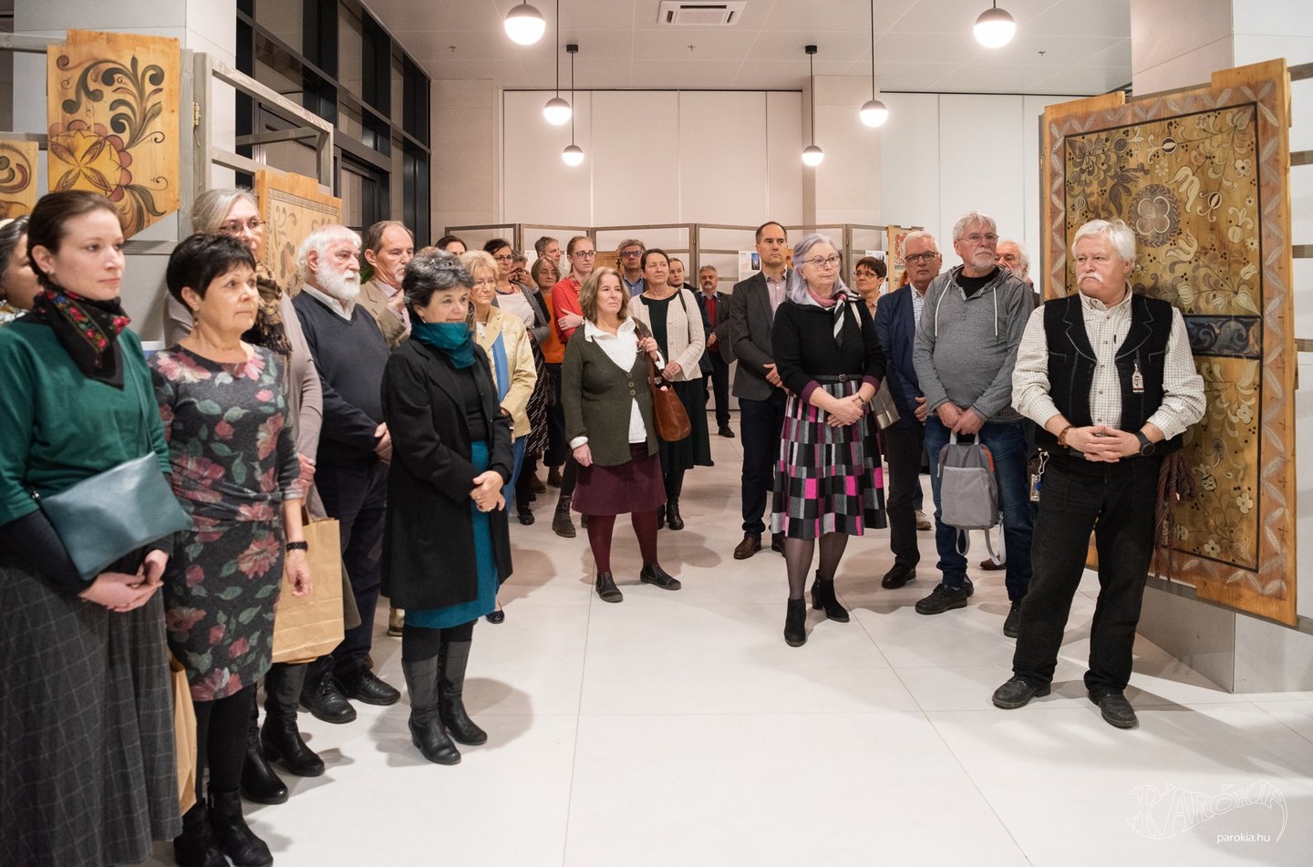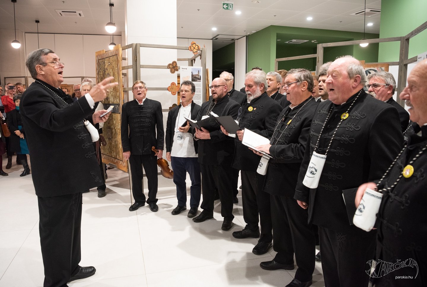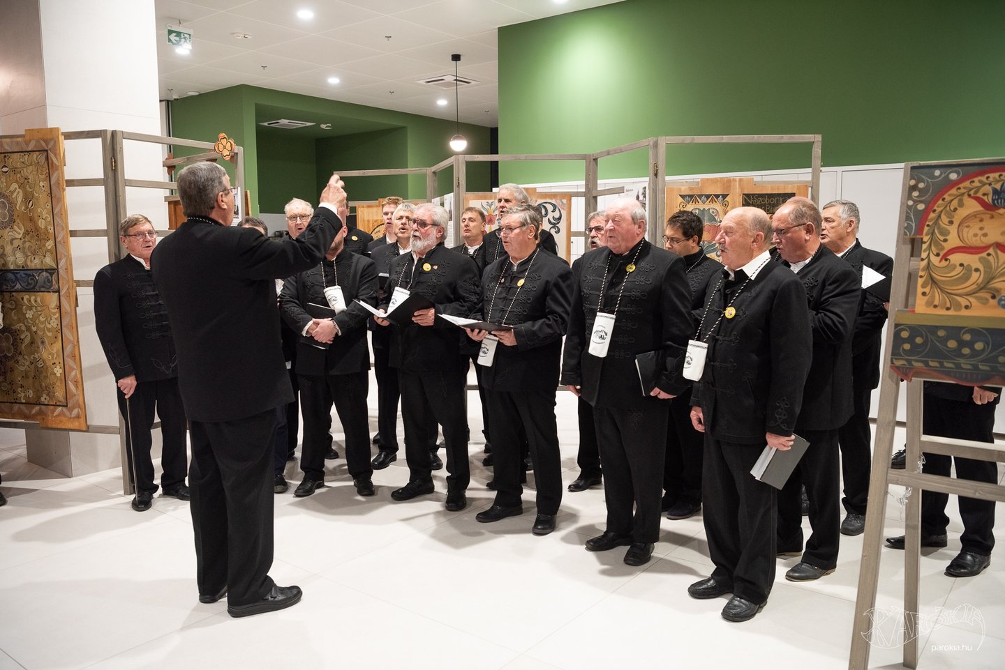 A megnyitó a Gyermelyi Férfi Dalárda énekes előadásával vette kezdetét. A harminc főből álló kórus nem először énekel Ament Éva kiállításmegnyitóján, a lelkes férfiak közt katolikus plébános és református lelkész egyaránt akad. Ahogy a fakazettás mennyezetek világa összeköti az anyaországiakat a határon túliakkal, úgy az erőteljes férfikórus dalaiban is Erdélytől a Felvidékig feltűnt minden táj, ahol értik a magyar szót.