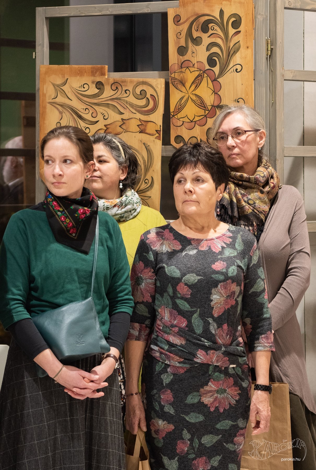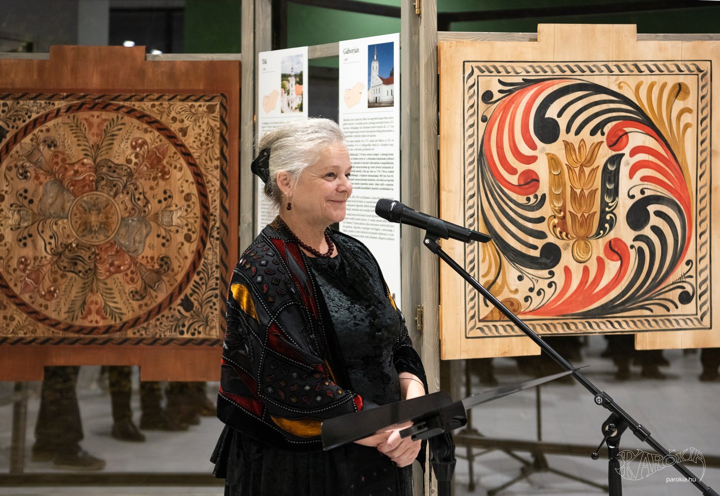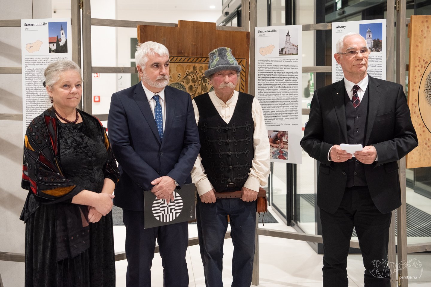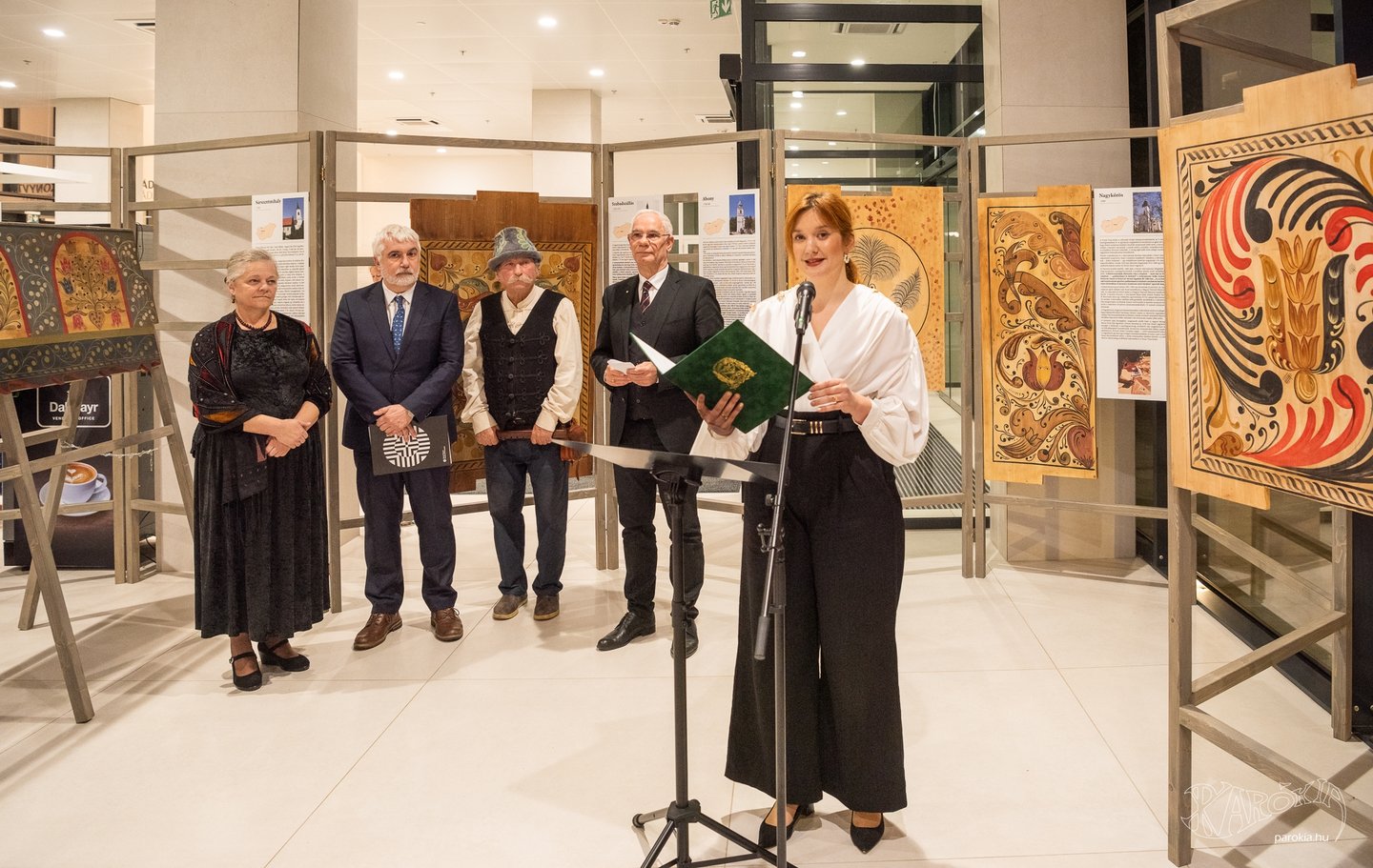 A megnyitó a Gyermelyi Férfi Dalárda énekes előadásával vette kezdetét. A harminc főből álló kórus nem először énekel Ament Éva kiállításmegnyitóján, a lelkes férfiak közt katolikus plébános és református lelkész egyaránt akad. Ahogy a fakazettás mennyezetek világa összeköti az anyaországiakat a határon túliakkal, úgy az erőteljes férfikórus dalaiban is Erdélytől a Felvidékig feltűnt minden táj, ahol értik a magyar szót.