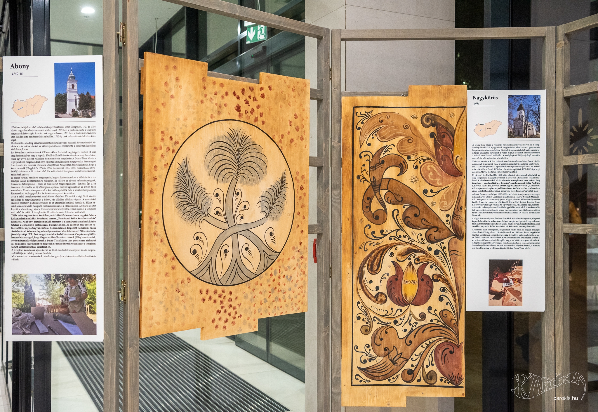 Nem véletlen, hogy éppen a Ráday Házban kelt életre ez a különleges kiállítás, hiszen az épületegyüttes megújulásakor díszeivel szintén a kazettás református templomok világához kapcsolódott. A Néprajzi Múzeum raktárából előkerült töki református templom mennyezetkazettái lélekemelő dekorációi lettek a Püspöki Hivatalnak. Az 1740-ben készült darabok is révkomáromi mester munkái, Szabó István készítette őket (István és János nevű segédeivel).