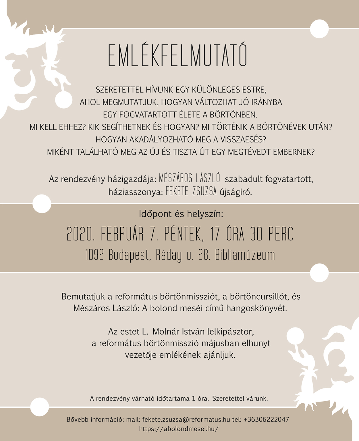 Hogyan változhat jó irányba egy fogvatartott élete a börtönben? Mi kell ehhez, kik segíthetnek és hogyan? Mi történik a börtönévek után? Hogyan akadályozható meg a visszaesés? Miként találhat egy megtévedt ember új és tiszta utat? Ez is kiderül Mészáros László szabadult fogvatartott A bolond meséi című hangoskönyvének bemutatóján 2020. február 7-én, pénteken 17.30-kor a budapesti Bibliamúzeumban (Ráday utca 28.).