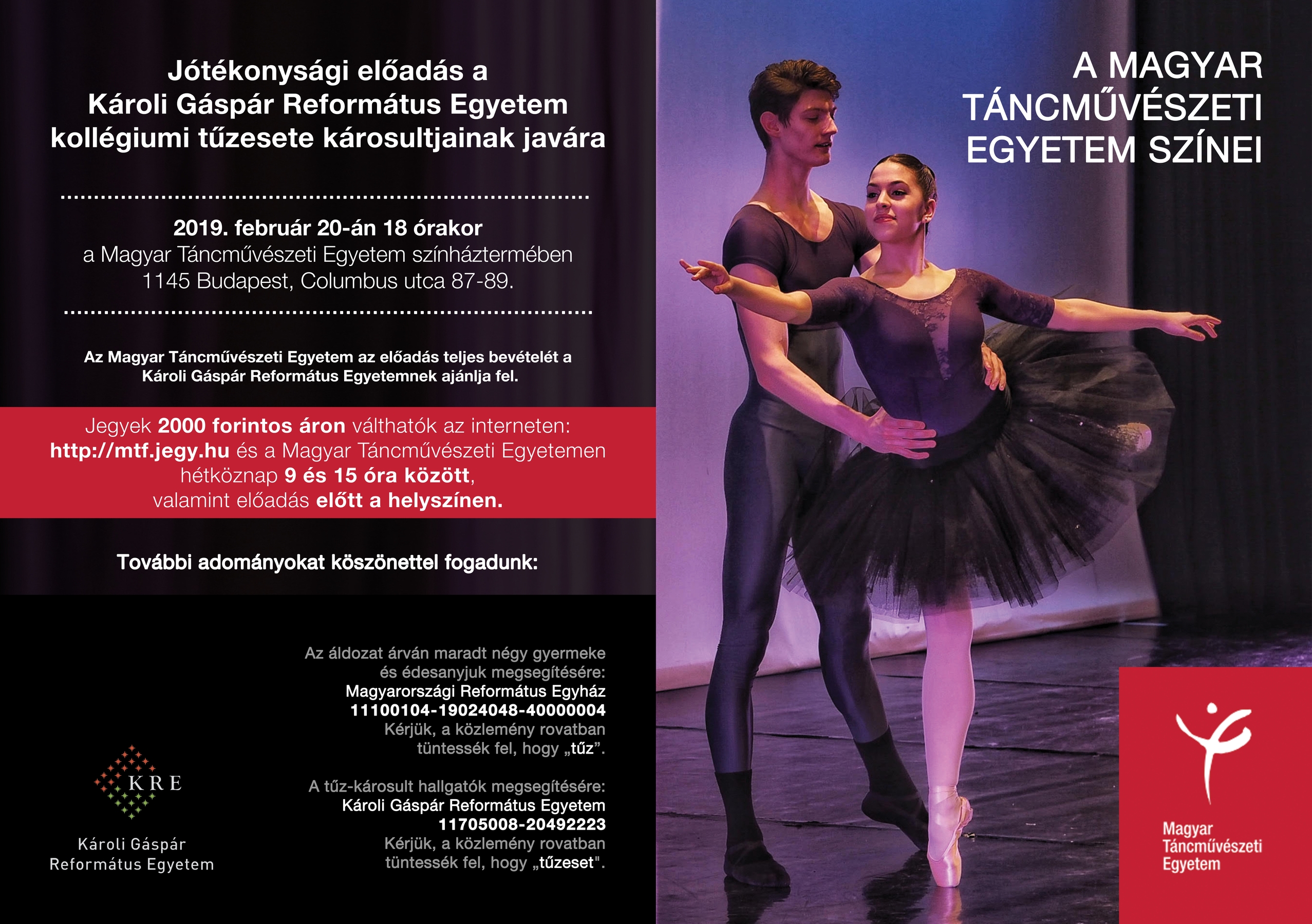 „A Magyar Táncművészeti Egyetem színei” címmel jótékonysági előadást szervez a Károli Gáspár Református Egyetem tűzesetének károsultjai javára a Magyar Táncművészeti Egyetem.