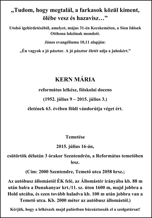 Kern Mária temetése 2015. július 16-án, csütörtökön délután 3 órakor lesz a szentendrei református temetőben.