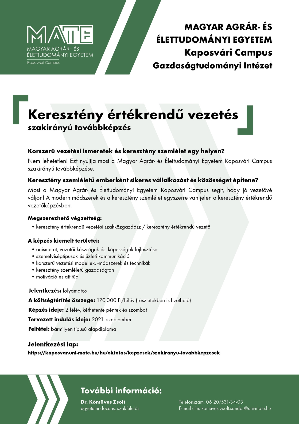 2021 szeptemberében a Magyar Agrár- és Élettudományi Egyetem 3. alkalommal indítja a Keresztény értékrendű vezetés szakirányú továbbképzését a négy történelmi egyház bevonásával.