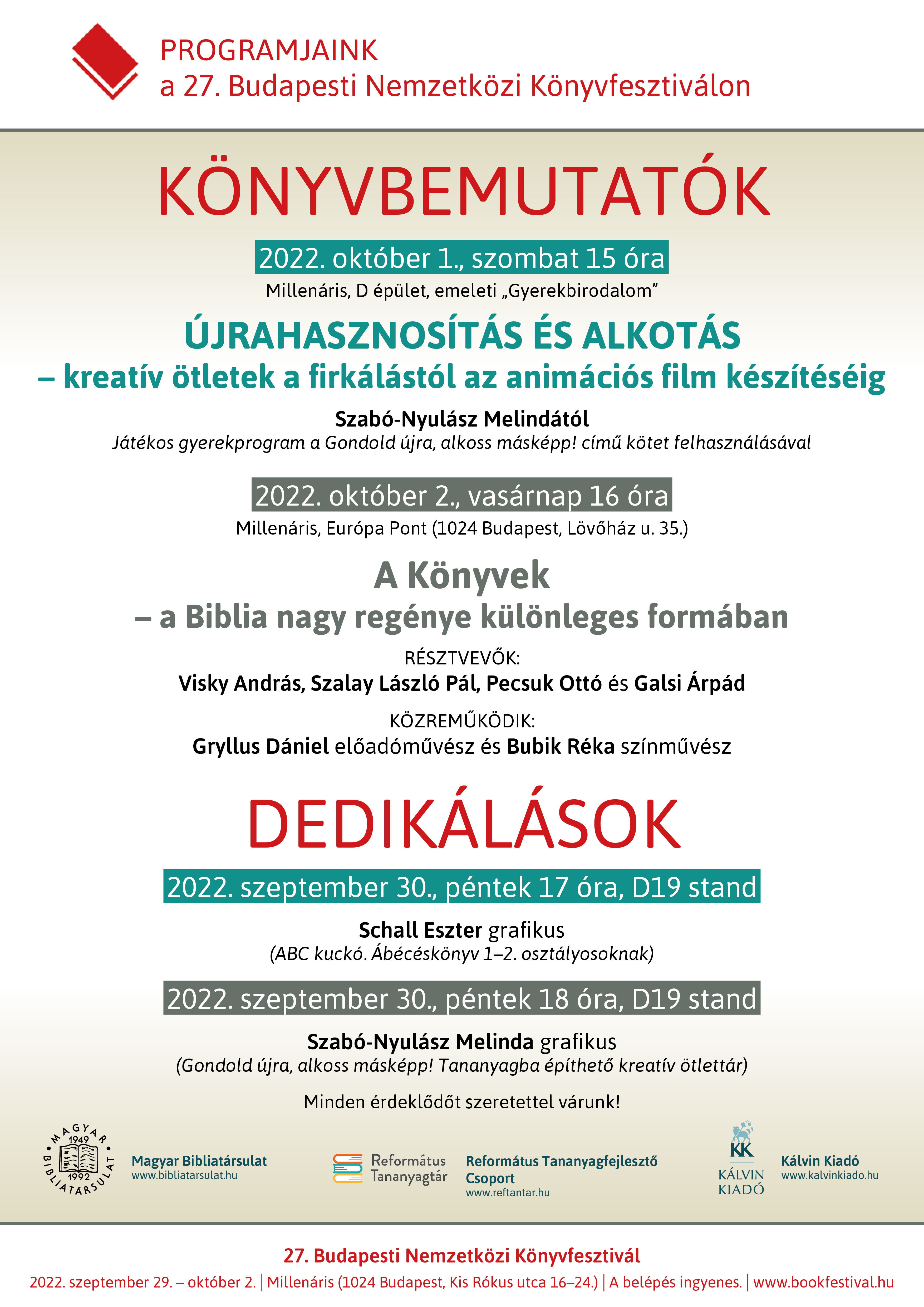A Magyar Bibliatársulat, a Kálvin Kiadó és társszervezőként a Református Tananyagfejlesztő Csoport programjai: