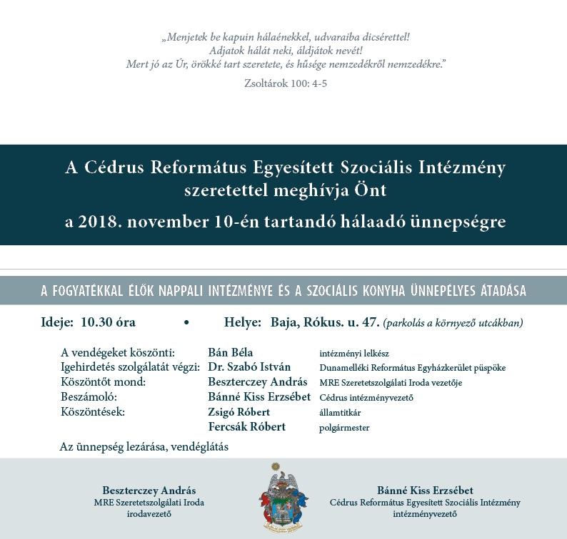 A hálaadó ünnepségen igét hirdet Dr. Bogárdi Szabó István dunamelléki püspök, a Magyarországi Református Egyház Zsinatának lelkészi elnöke, köszöntőt mond Beszterczey András, az MRE Szeretetszolgálati Iroda vezetője, Zsigó Róbert államtitkár és Fercsák Róbert polgármester.