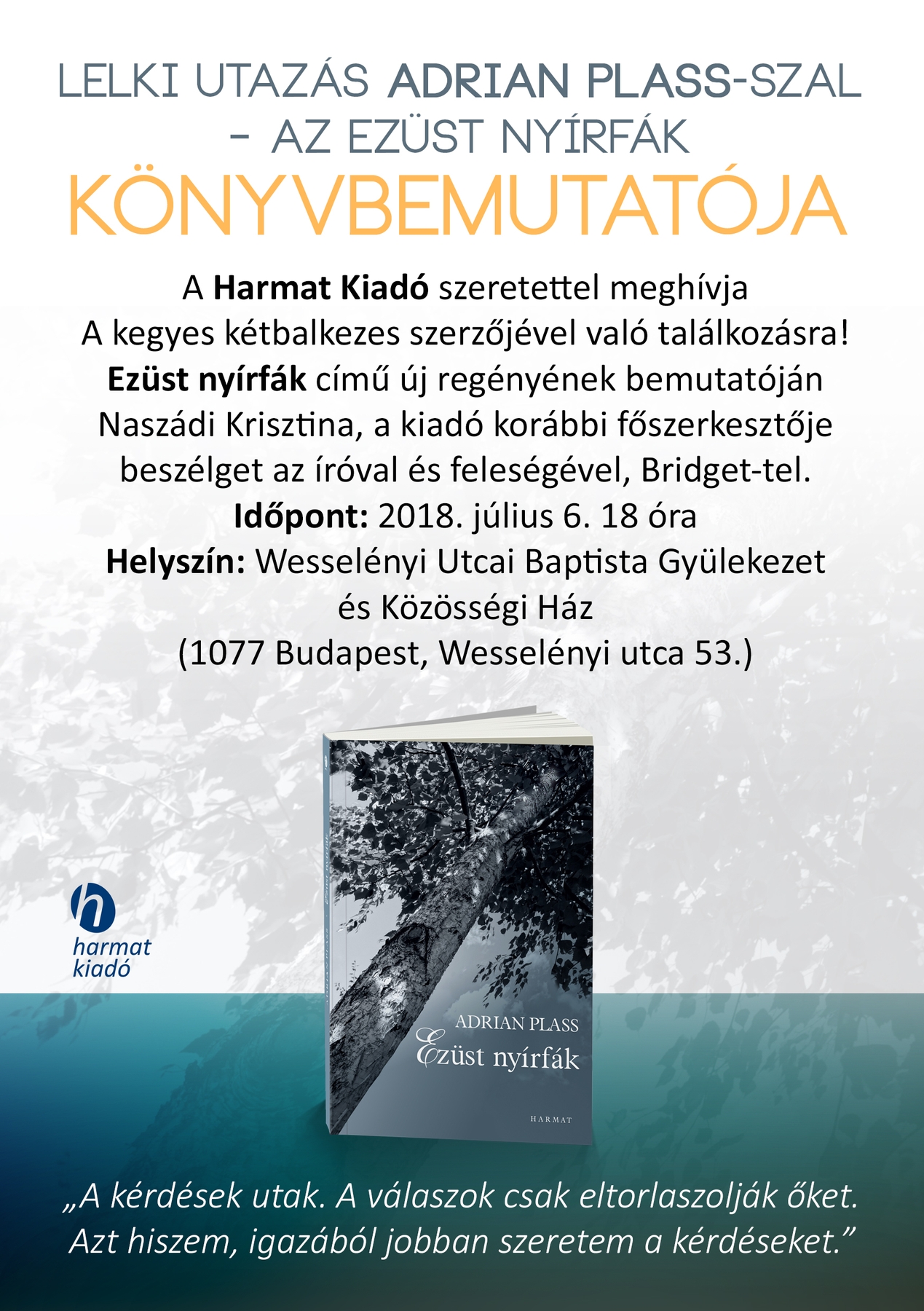 A Harmat Kiadó szeretettel várja A kegyes kétbalkezes szerzőjével való találkozásra! Ezüst nyírfák című új regényének bemutatóján Naszádi Krisztina, a kiadó korábbi főszerkesztője beszélget a szerzővel és feleségével, Bridget-tel.