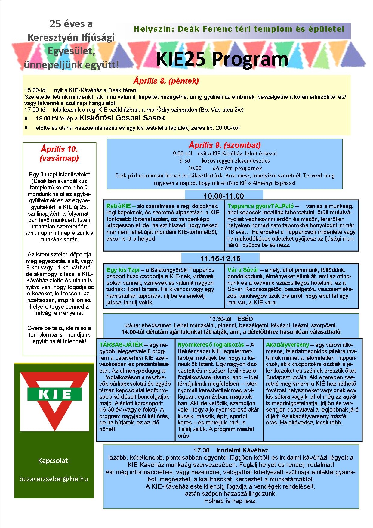 Ünneplünk. Ünnepeljük, hogy fennmaradt a KIE, hogy vannak működő munkaágai, ünnepeljük a múltunkat és megosztjuk az örömünket a jelenlévőkkel. Ha Te, gyülekezeted, csoportod, családod érdeklődik az ifjúsági munka iránt, hasznos módszertani tapsztalatokkal lehet gazdagabb a hévége után. Ha csak simán szórakoznál egy koncert erejéig vagy egy irodalmi kávéházban, vagy csak arra jársz és innál egy teát, játszanál valamit vagy csak beszélgetnél, beugorhatsz hozzánk. Programjaink ingyenesek, részletesen pedig a www.kie.hu oldalon is elolvashatók. Szeretettel várunk!
