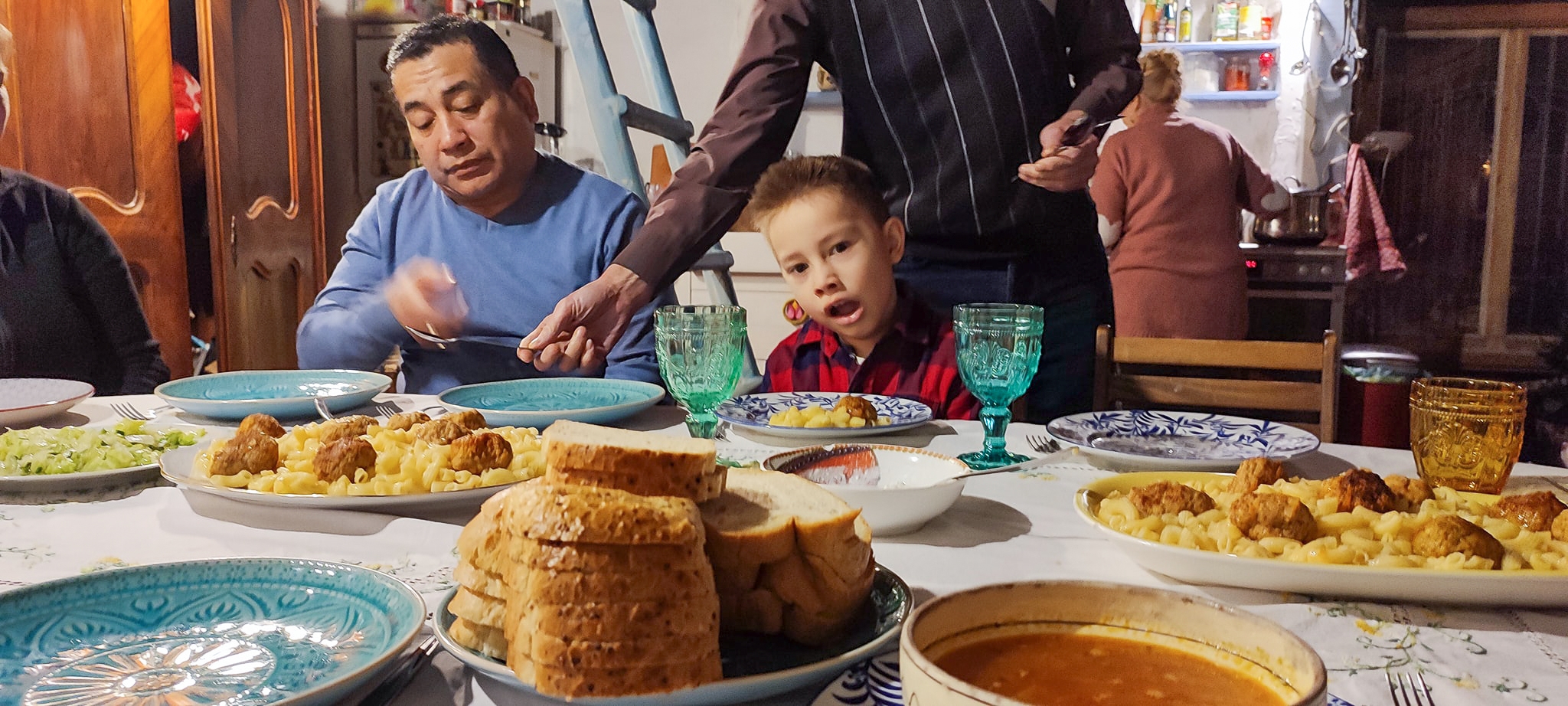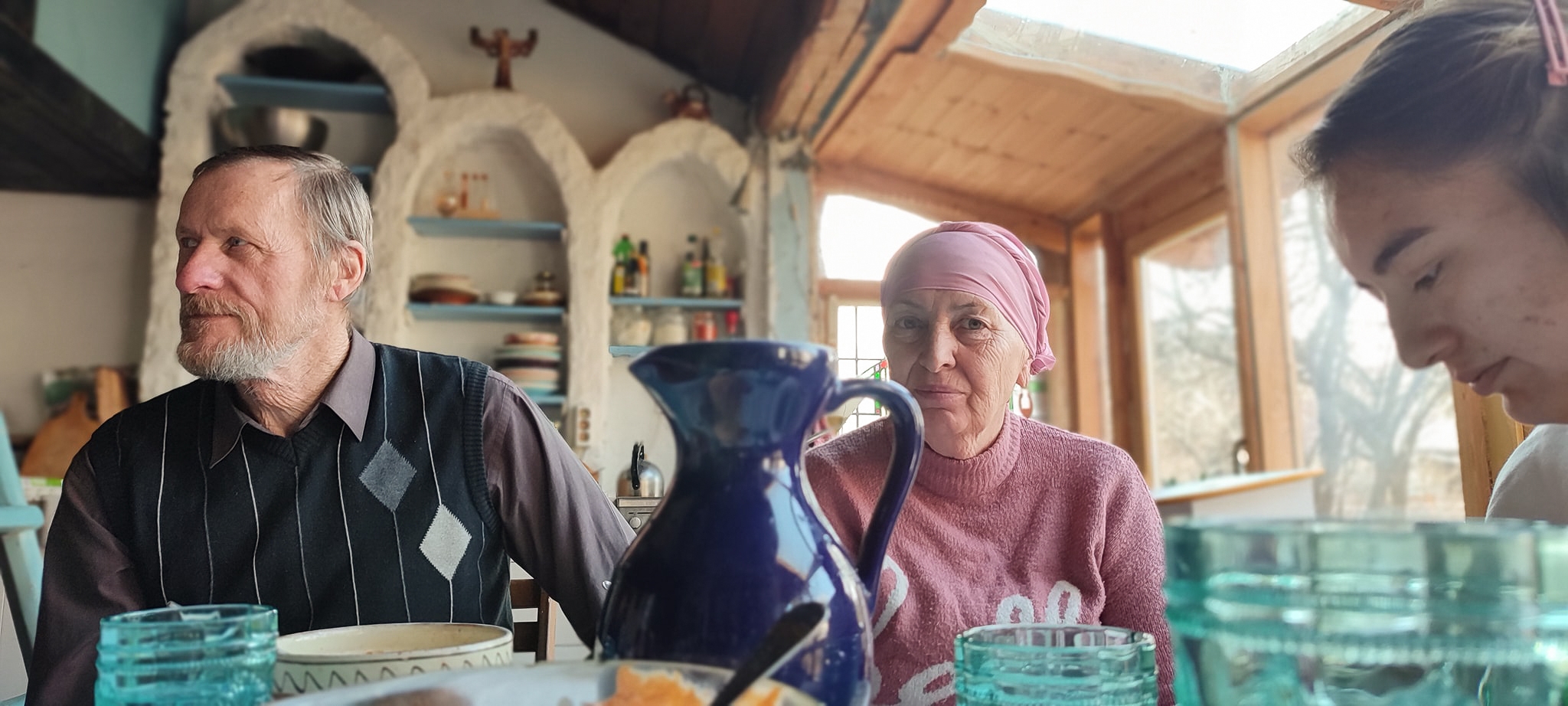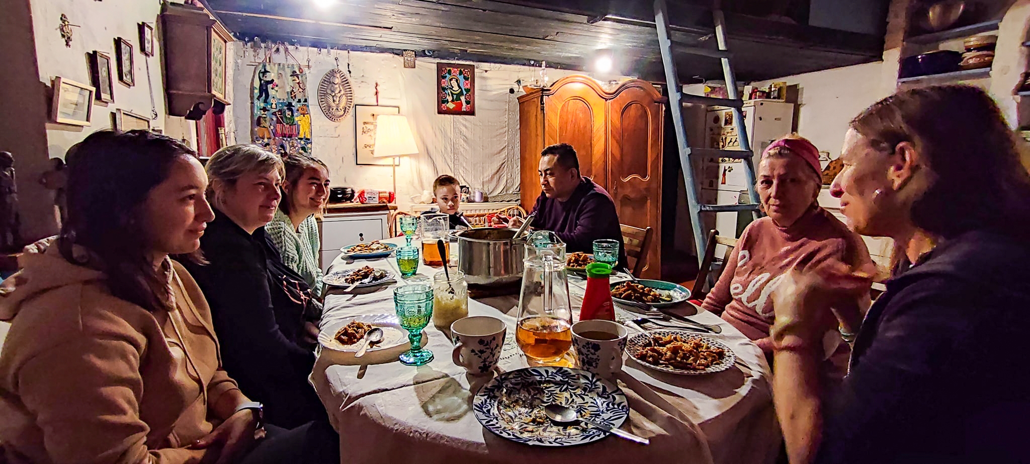 Gyéduska – a csaknem nyolcvan éves nagypapa – eközben sokat mesélt az ukrán kultúráról, a népről, a hazáról. Rengeteget énekeltünk – gyönyörű, többszólamú ukrán dalokat mutattak nekünk. Sokat nevettünk és sírtunk is. A kismama, aki a férjétől el kellett, hogy szakadjon, a harmadik napon mosolyodott el egy kicsit először. A nyolcéves kisfiú napokon át csak fekete ceruzával rajzolt, semmi mást, csak kenyeret. Kaptunk tőle ajándékba egy rajzot, ezen mindannyian körbeüljük az asztalt, fogjuk egymás kezét – így szoktunk hálát adni. A legszélső alak a kezében tart egy kenyeret, amire cirill betűkkel, spanyolul rá van írva, hogy el pan – a kenyér. Ez az egyetlen felirat az egész rajzon.