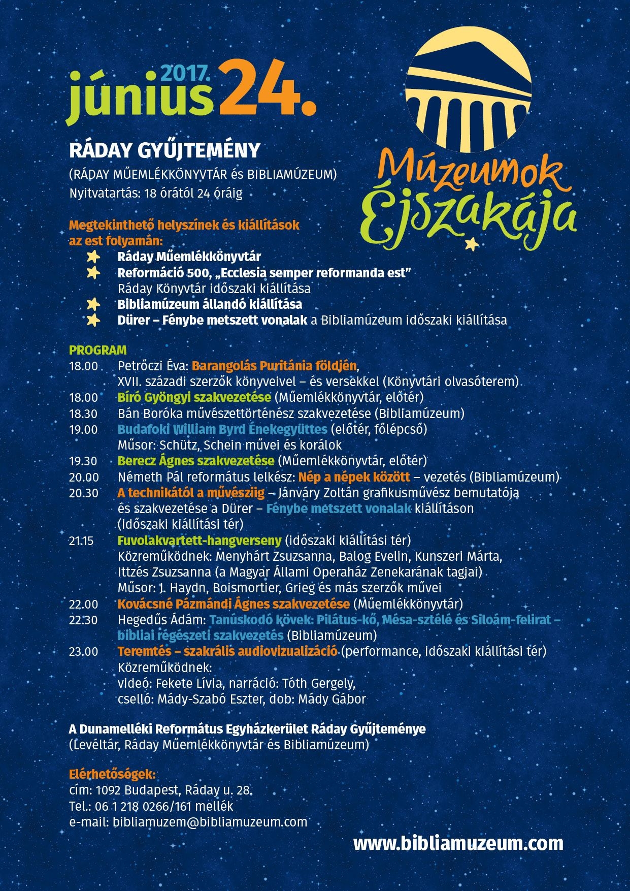 Múzeumok Éjszakája a Ráday Gyűjteményben 0 hozzászólás Időpont: 2017. június 24. 18:00-24:00 Helyszín: Ráday Gyűjtemény és Bibliamúzeum, Budapest, Ráday utca 28. Programok
