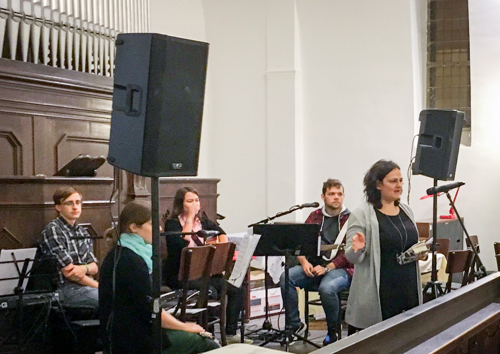 A Pintér Béla által szerzett dicséretet együtt éneklik a 2017-es imaéjjelen itt, a Salétrom utcai Református Gyülekezet templomában összegyűlt fiatalok.