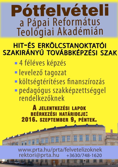 A Pápai Református Teológiai Akadémia pótfelvételt hirdet a 2016/2017-es tanévre Hit-és erkölcstanoktatói szakirányú továbbképzési szakára.