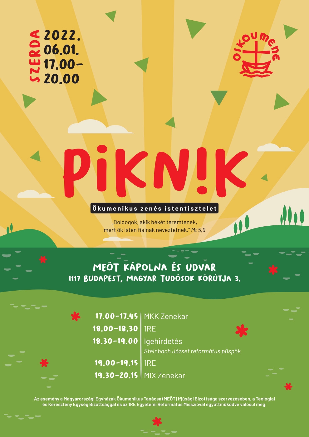 „Boldogok, akik békét teremtenek, mert ők Isten fiainak neveztetnek” (Mt 5,9) – szól az este vezérigéje. – Idén a békesség évét hirdettük meg. Januárban döntöttünk így, amikor még nem tudtuk, hogy háború fog kitörni a szomszédságunkban – fogalmaz Fischl Vilmos, a MEÖT főtitkára, amikor a piknik alapigéjének kiválasztásáról kérdezzük. Fischl Vilmos úgy látja, az ökumené gondolatában alapvetően benne van a békességre törekvés és fontosnak látja, hogy ezt a gondolat minél több fiatalt elérjen.