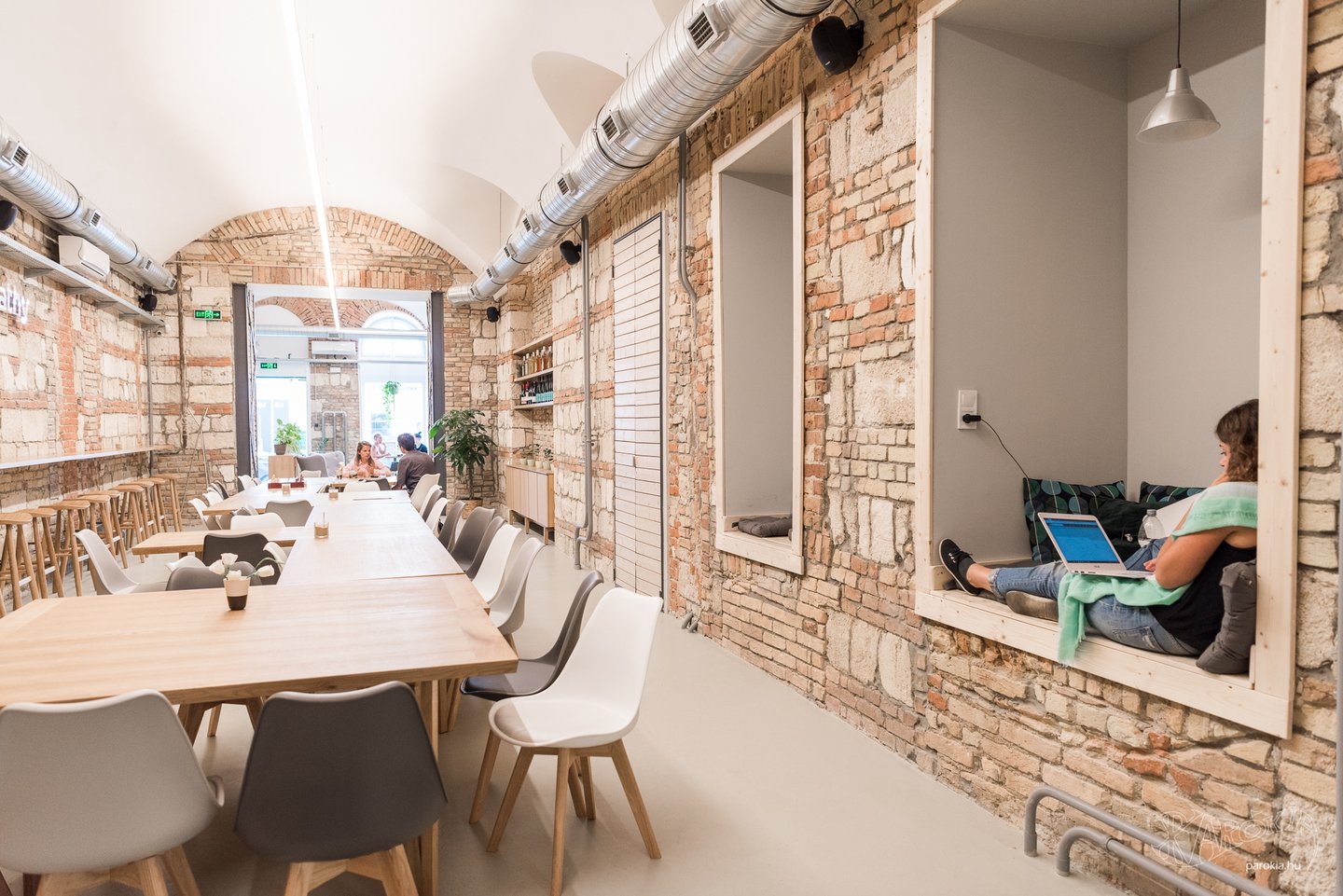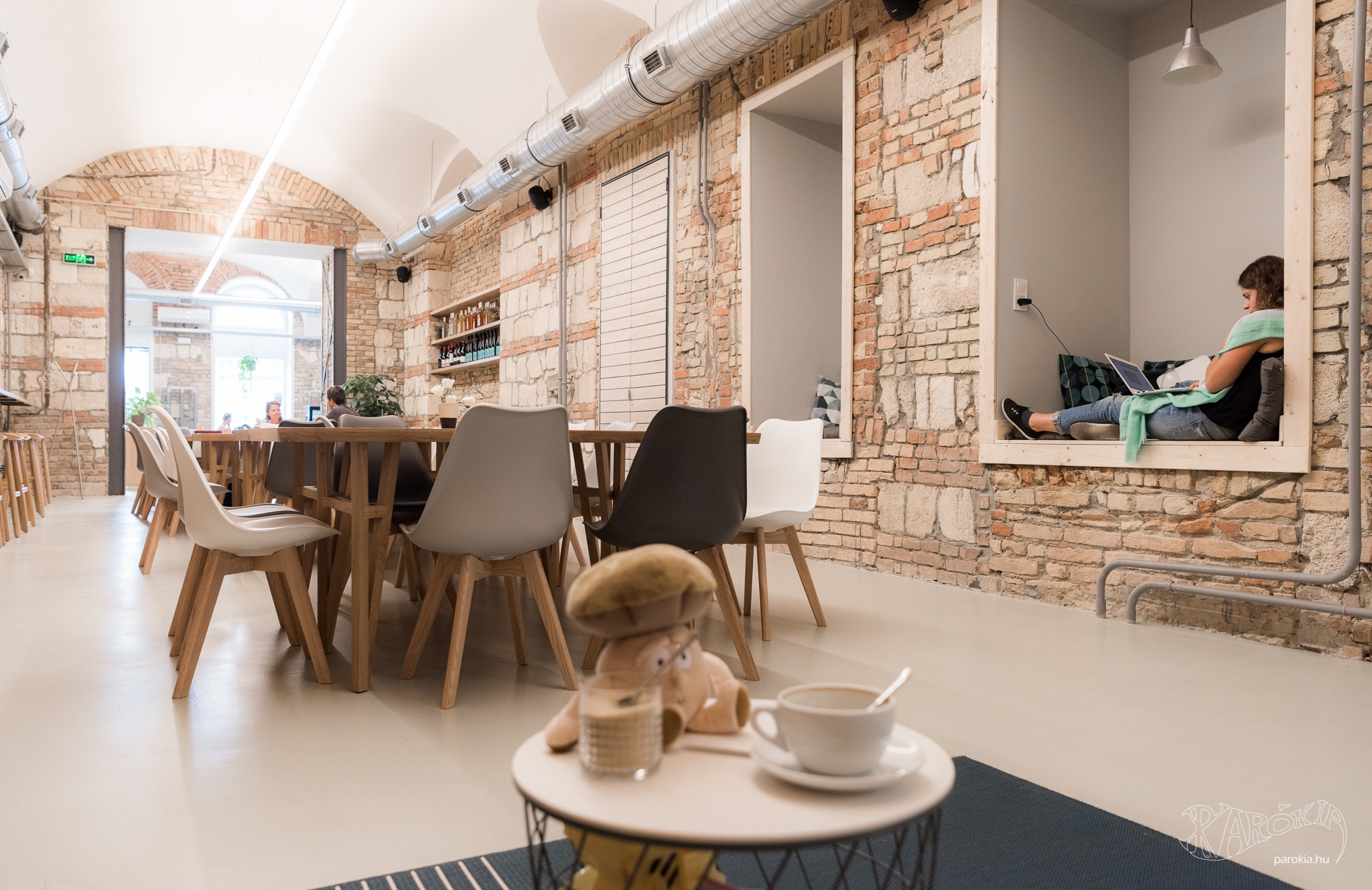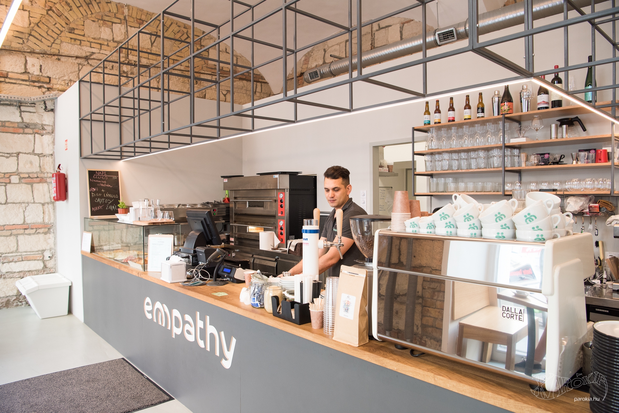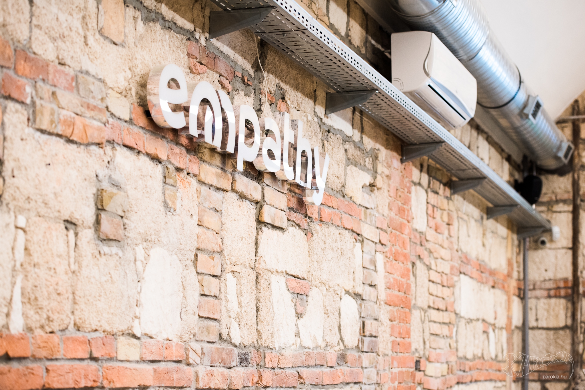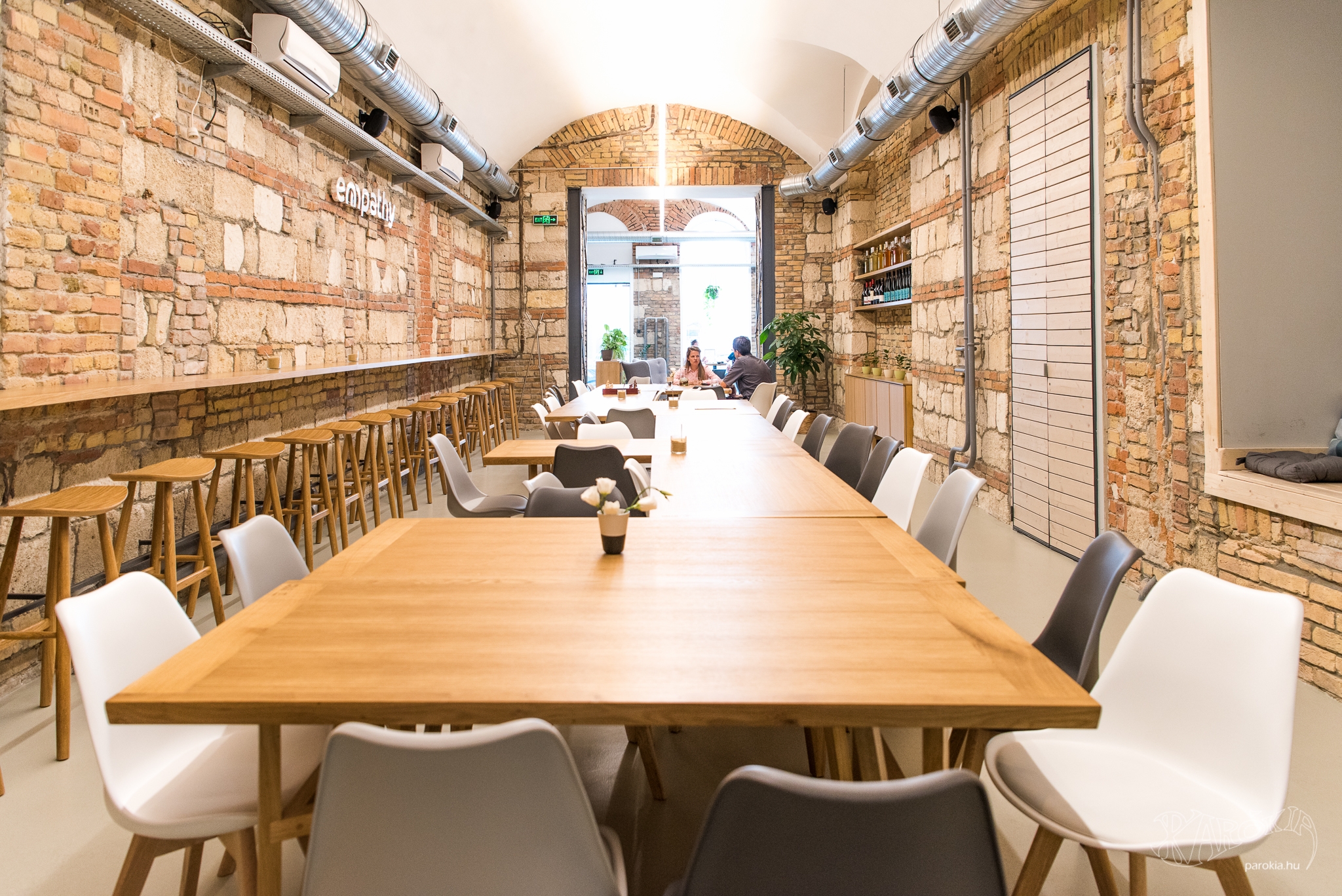 Emellett vannak távlati terveik is. „A mellettünk lévő termet szeretnénk majd hosszú távon korszerűsíteni, konferenciateremmé alakítani. Az épület 1907-ben épült, a terem az ennek megfelelő állapotban van még." Apropó, 1907-es állapotok. A kávézó kialakításához szükséges bontási munkák közben derült ki, hogy igen vegyes összetételű falazat rejlik a vakolat mögött, emiatt döntött úgy az építész, hogy ezt érdemes meghagyni és megmutatni. Az Empathy falán látható, ahogyan szépen illeszkedik egymáshoz többféle tégla és terméskő. „Ettől lett olyan élő és sokféle a tér. Ahogyan mi is sokfélék vagyunk, de utána összeállunk valami szilárd egésszé."