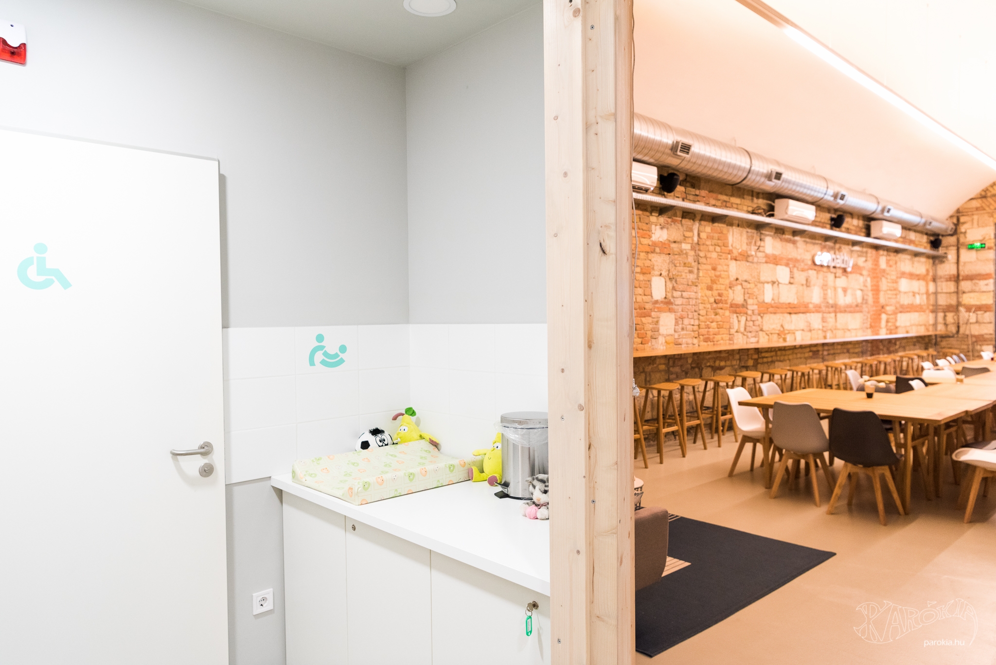 Az empátiára nevelést, az érzékenyítést elsősorban a programok szintjén próbálják megvalósítani, de a hely kialakításánál is figyeltek erre. Van mozgássérült-bejárat, van külön mozgássérült mosdó, és a teljes kávézó akadálymentes. A pelenkázó nincsen elbújtatva a női mosdóban, hanem a mosdók előterébe került. „Így mindkét szülő részt tud venni a pelenkázásban, és ez is fontos üzenet." Van úgynevezett indukciós hurok is, amely a környezet zajainak a kizárásával közvetlenül közvetíti a hallókészülékkel érkezők számára a mikrofonba mondottakat. Szeretnének majd olyan étel- és itallapot, amelyen Braille-írással is rajta van a kínálat.