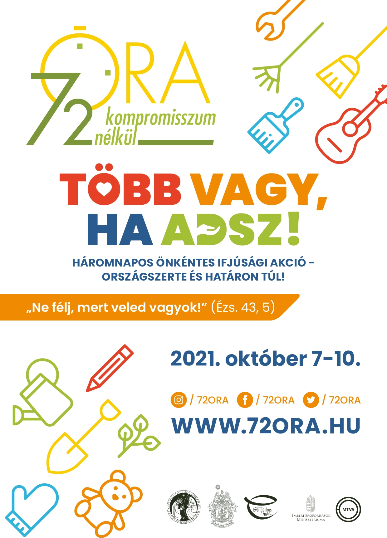Idén is megrendezik, immár 14. alkalommal az ország legjelentősebb önkéntes akcióját. A katolikus, református és evangélikus egyházak összefogásával létrejövő 72 óra kompromisszumok nélkül a hagyományoknak megfelelően október második hétvégéjén, 2021. október 8. és 10. között zajlik majd azzal a céllal, hogy felhívja a figyelmet az önzetlen segítségnyújtás és az önkéntes munka fontosságára.