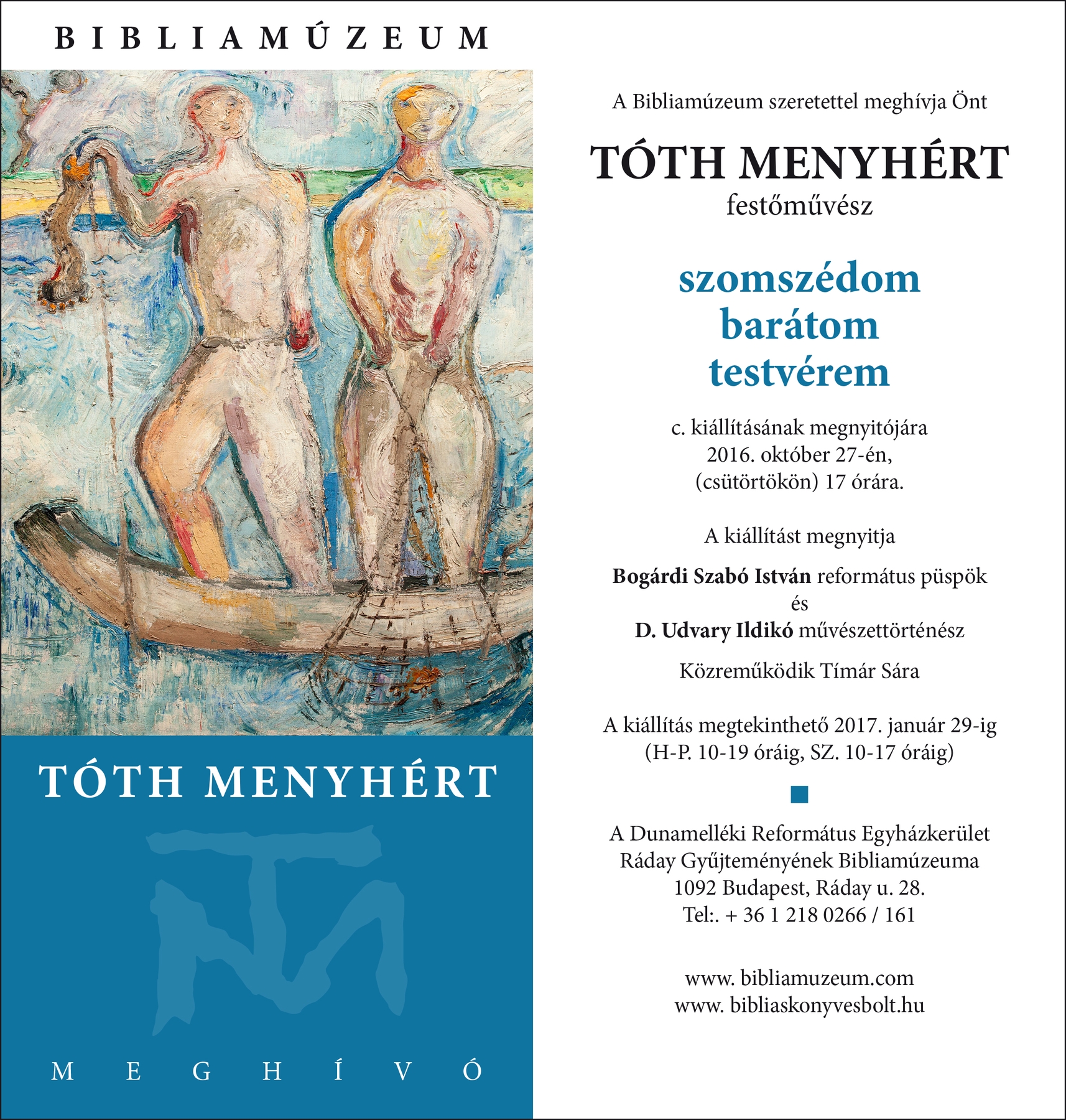 A Bibliamúzeum szeretettel meghívja Tóth Menyhért szomszédom, barátom, testvérem c. kiállításának megnyitójára.