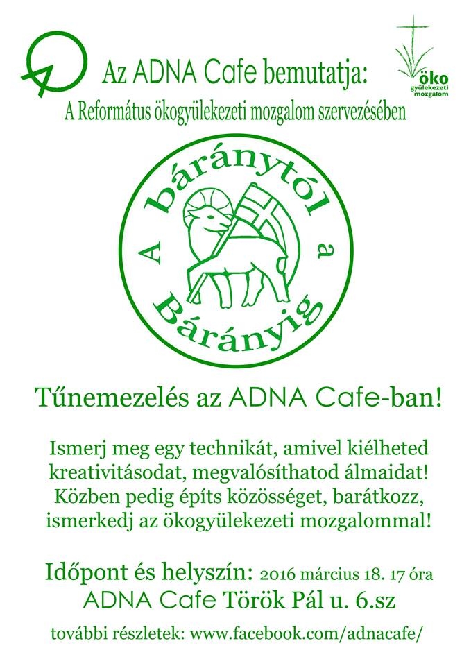 A tűnemezelés remek lehetőséget ad hitoktatók, ifivezetők és minden kreatív ember kezébe. A közös munka során alkotó közösség épülhet egy természetes anyag, a gyapjú sokoldalú felhasználásával. A Református Ökogyülekezeti Mozgalom "A báránytól a Bárányig" elnevezésű programja az elmúlt fél évben hét helyszínen több mint száz érdeklődőnek nyújtott segítséget a tűnemezelés elsajátításában. Az ADNA Cafe-ban szeretettel várunk minden érdeklődőt 2016 március 18-án 17 órától!
