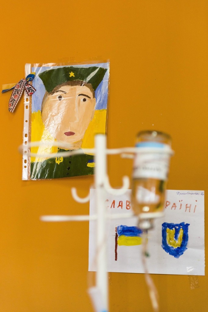 "A gyerekeim rajzolták, de jött látogatóba több iskolás, és ők is kitették a falra a rajzaikat - magyarázta az MTI-nek Andrij Rencsuk, a kórházban ápolt egyik beteg, hozzátéve, a rajzok segítik gyógyulását. Egy másik sebesült, Igor Voitovyeh elárulta, „a fronton többször hallották a rádión, hogy női mesterlövészeket vetnek be ellenük", ő is az egyikük áldozata - a lábát találta el a golyó.