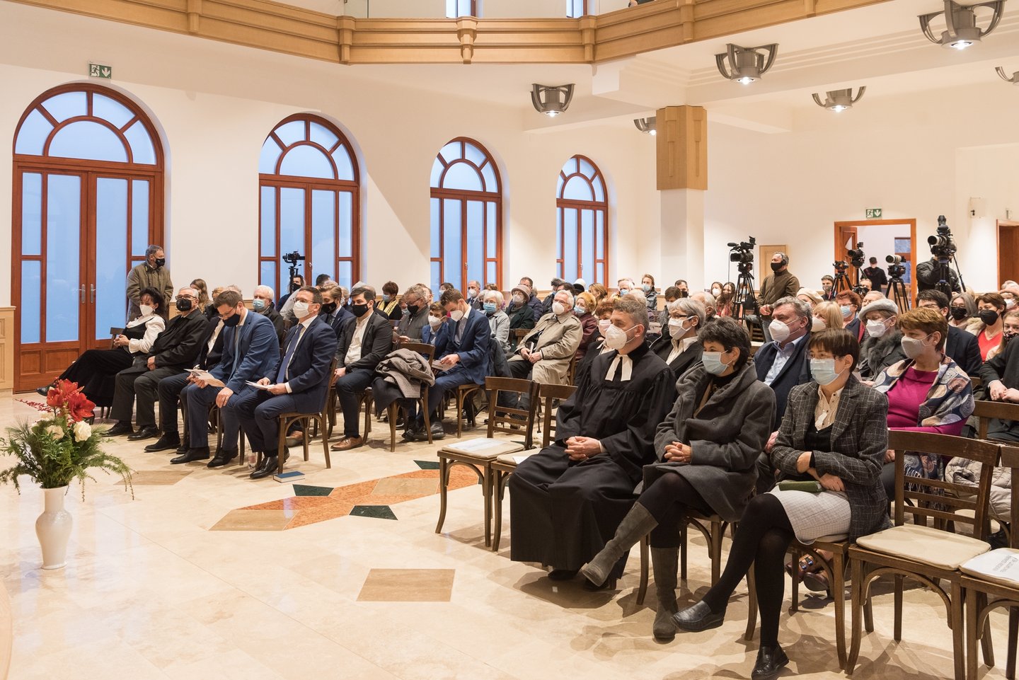 Pokorni Zoltán XII. kerületi polgármester egy régi, Makovecz Imre építésszel folytatott beszélgetését idézte fel köszöntőjében. „Azt mondta nekem, hogy mekkora hite lehetett őseinknek, akik a török hódítás után a szinte elnéptelenedett Alföldön templomokat építettek. Mivel ők csak a templomaik legelső sorait voltak képesek betölteni, mindez a jövőbe vetett hitükről tanúskodott.” Elmondta, hogy az önkormányzat számára a legtöbb, amit a gyülekezettől kaphat, az a közösség építése. Elsősorban ezért tartoznak köszönettel.