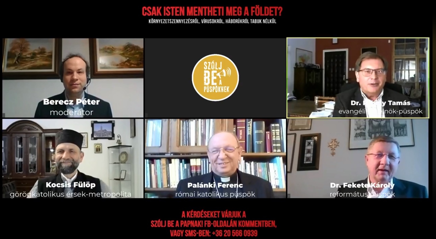 Csak Isten mentheti meg a Földet? Vagy éppen Ő büntet miket bűneinkért a koronavírussal? Ez itt már a végítélet? Megoldásként térjünk vissza a természethez? A Szólj be a Papnak rendezvénysorozat ezúttal négy püspöknek szegezte fel a fenti kérdéseket online videókonferenciája során. A beszélgetés moderátora Berecz Péter volt, a téma kereteit pedig az előzetesen beérkezett kérdések adták, amelyek az élő adás során újabbakkal egészültek ki. A résztvevők Fabiny Tamás evangélikus elnök-püspök, Fekete Károly tiszántúli református püspök, Kocsis Fülöp görögkatolikus érsek-metropolita és Palánki Ferenc római katolikus püspök voltak.